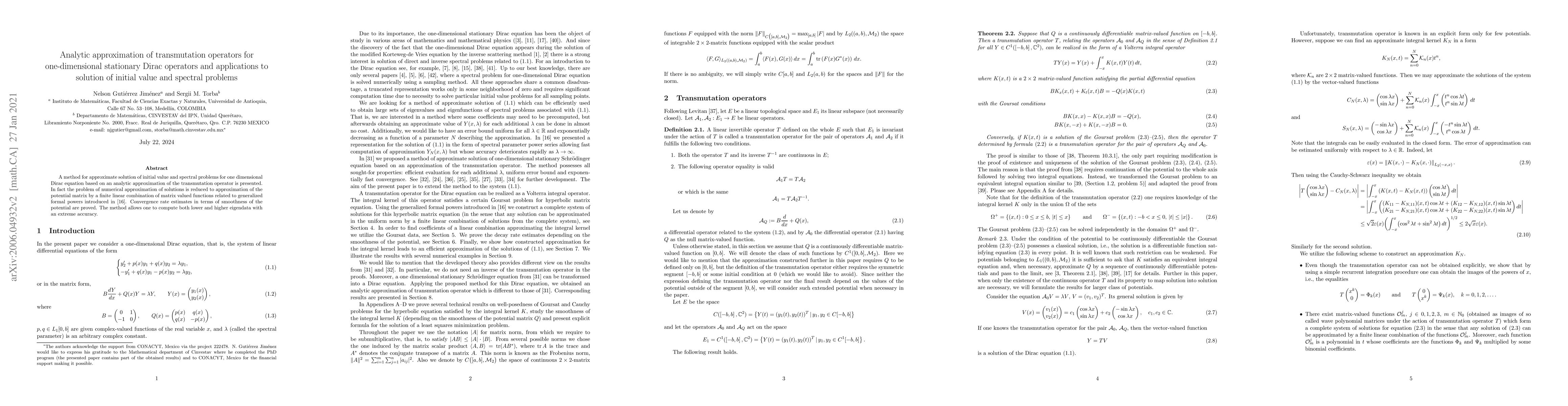 This paper presents an analytic approximation method for solving initial value and spectral problems of the one-dimensional Dirac equation by approximating the transmutation operator. The method reduces numerical solution to approximating the potential matrix, achieving high accuracy in computing eigendata.