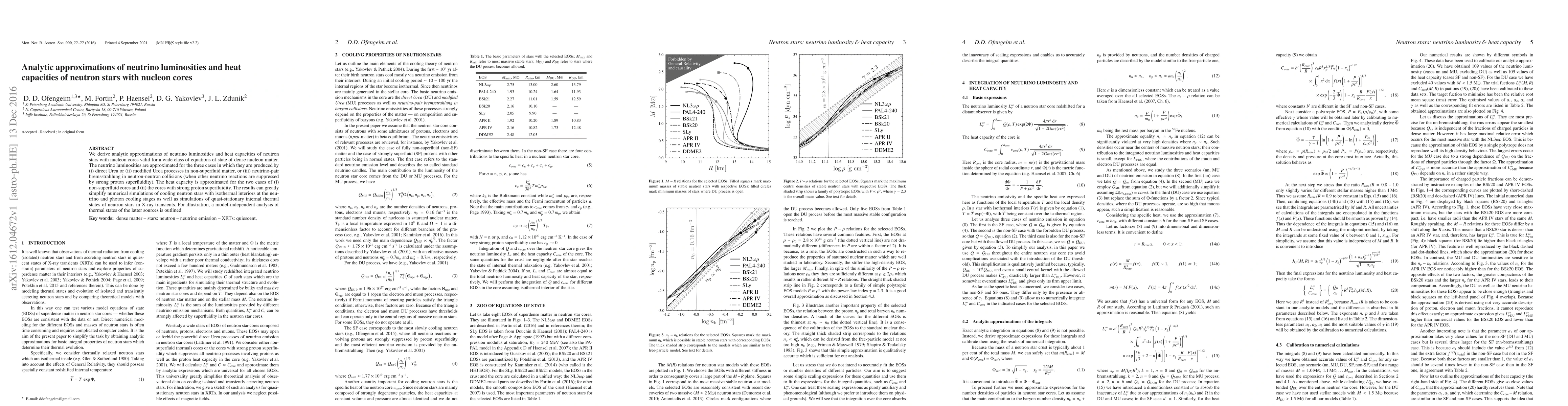 This paper provides analytic approximations for neutrino luminosities and heat capacities of neutron stars with nucleon cores, applicable across various equations of state. The approximations cover different neutrino production processes and superfluid effects, simplifying simulations of neutron star cooling and thermal states.