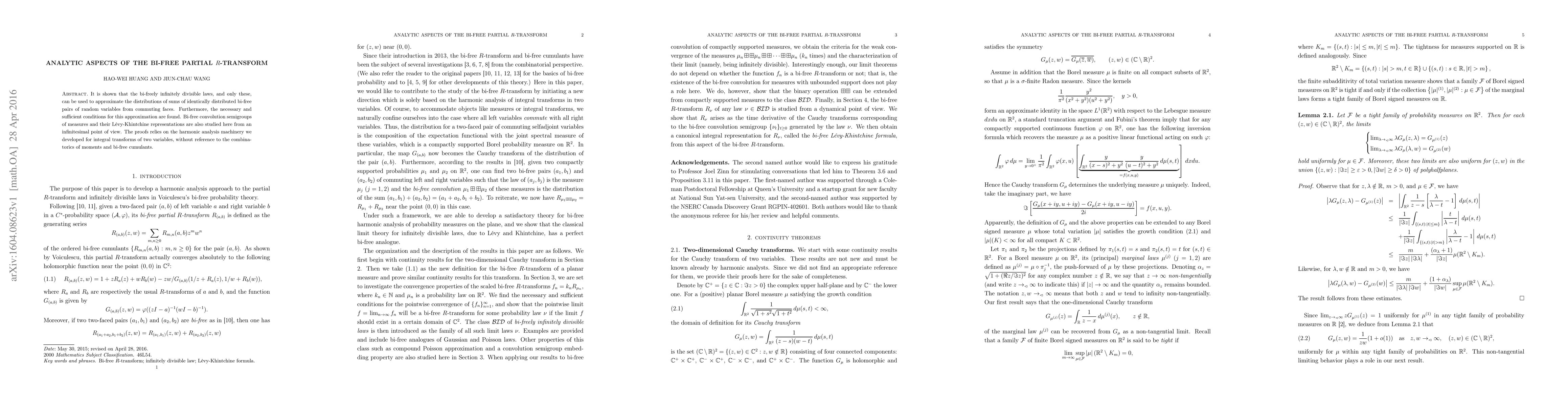 This paper proposes a harmonic analysis approach to the bi-free partial R-transform, focusing on integral transforms of two variables for bi-freeness with commuting faces. The method accommodates measures with unbounded support and demonstrates a bi-free analogue of the classical limit theory of infinitely divisible laws.