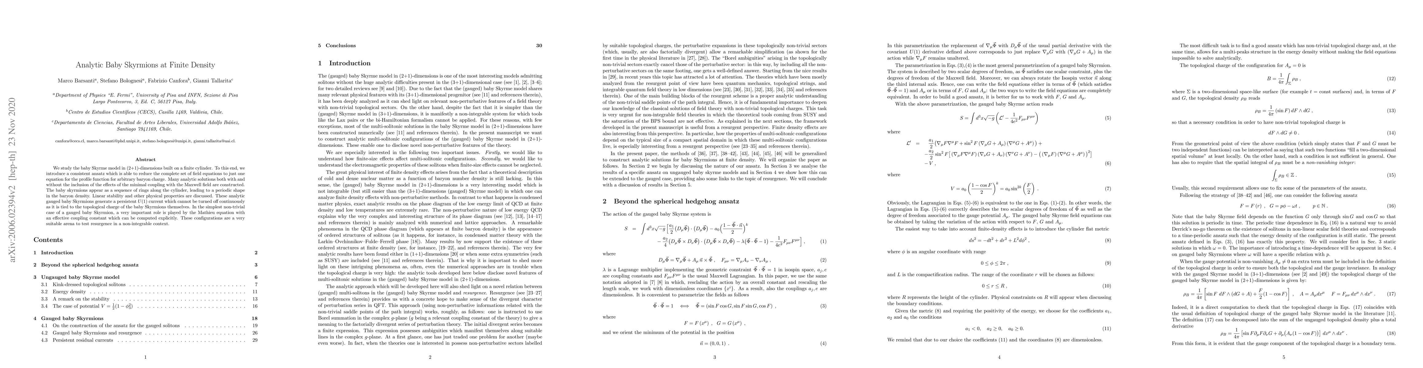 We introduce a consistent ansatz for the baby Skyrme model in (2+1)-dimensions which is able to reduce the complete set of field equations to just one equation for the profile function in situations in which the baby baryon charge can be arbitrary. Many analytic solutions both with and without the inclusion of the effects of the minimal coupling with the Maxwell field are constructed. Linear stability and other physical properties are discussed. These analytic gauged baby Skyrmions generate a persistent $U(1)$ current which cannot be turned off continuously as it is tied to the topological charge of the baby Skyrmions themselves. In the simplest non-trivial case of a gauged baby Skyrmion, a very important role is played by the Mathieu equation with an effective coupling constant which can be computed explicitly. These configurations are a very suitable arena to test resurgence in a non-integrable context.