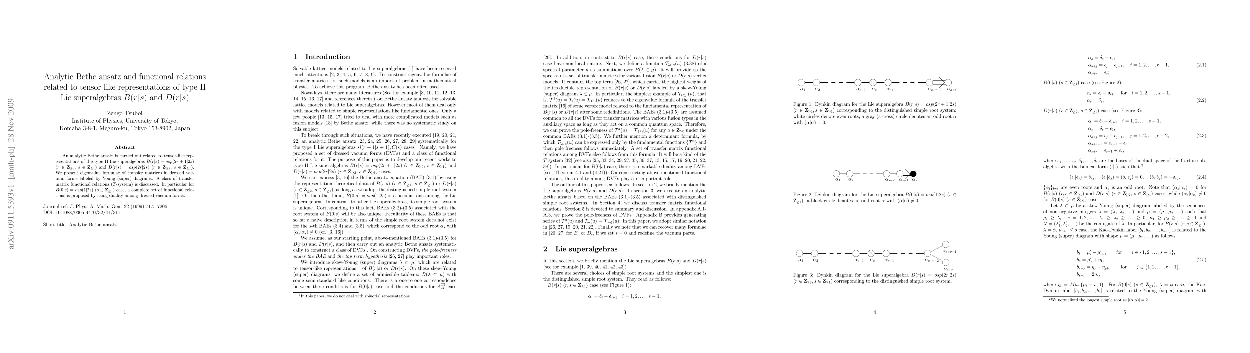 An analytic Bethe ansatz is carried out related to tensor-like representations of the type II Lie superalgebras B(r|s)=osp(2r+1|2s) (r > -1, s >0) and D(r|s)=osp(2r|2s) (r >1, s >0). We present eigenvalue formulae of transfer matrices in dressed vacuum forms labeled by Young (super) diagrams. A class of transfer matrix functional relations (T-system) is discussed. In particular for B(0|s)=osp(1|2s)(s >0) case, a complete set of functional relations is proposed by using duality among dressed vacuum forms.