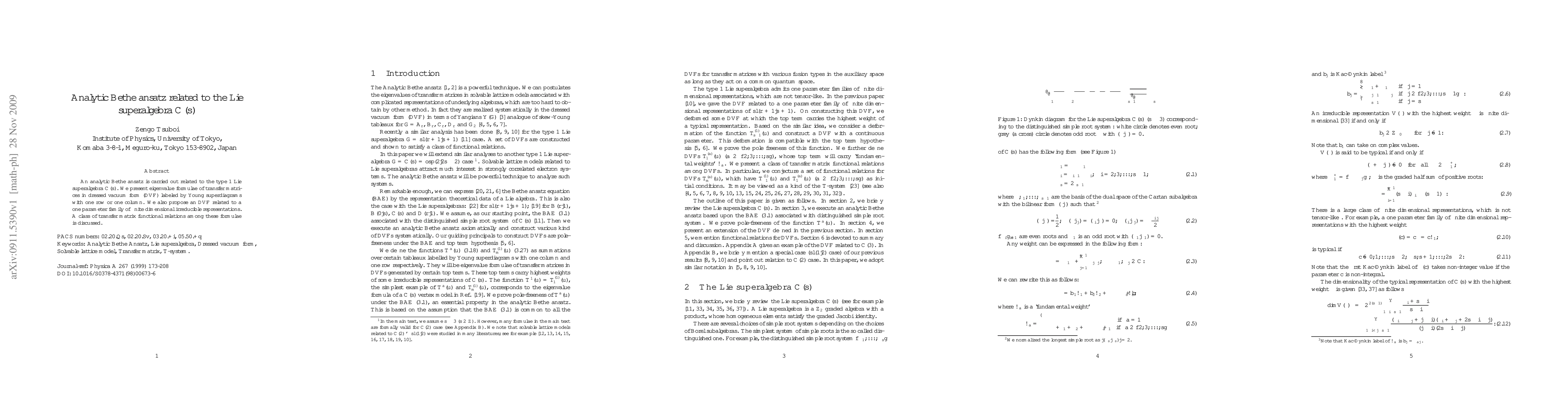 This paper develops an analytic Bethe ansatz for the type 1 Lie superalgebra C(s), providing eigenvalue formulae for transfer matrices labeled by Young superdiagrams. It also introduces a dressed vacuum form related to a one-parameter family of finite-dimensional irreducible representations and discusses functional relations among the transfer matrices.