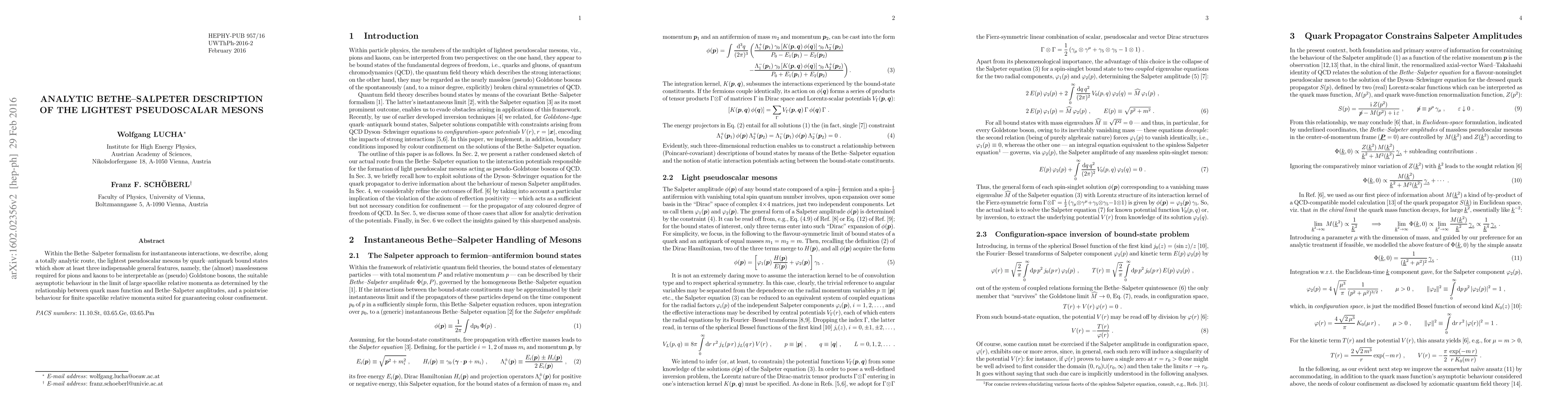 Summary: This paper analytically explores the Bethe-Salpeter formalism to describe the lightest pseudoscalar mesons as quark-antiquark bound states, emphasizing their masslessness, appropriate asymptotic behavior, and confinement properties.