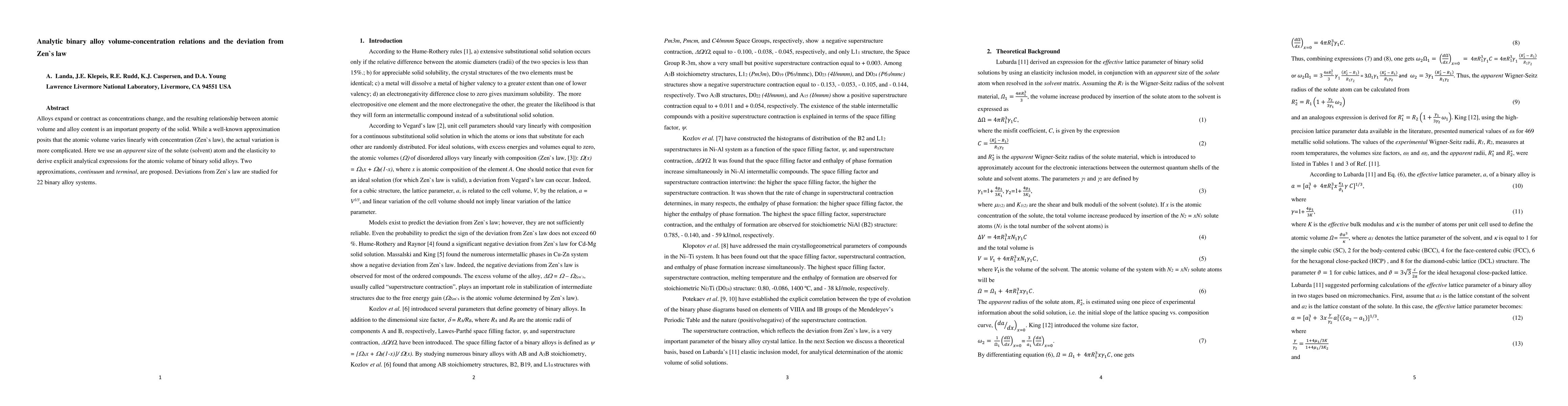 Alloys expand or contract as concentrations change, and the resulting relationship between atomic volume and alloy content is an important property of the solid. While a well-known approximation posits that the atomic volume varies linearly with concentration (Zen`s law), the actual variation is more complicated. Here we use an apparent size of the solute (solvent) atom and the elasticity to derive explicit analytical expressions for the atomic volume of binary solid alloys. Two approximations, continuum and terminal, are proposed. Deviations from Zen`s law are studied for 22 binary alloy systems.