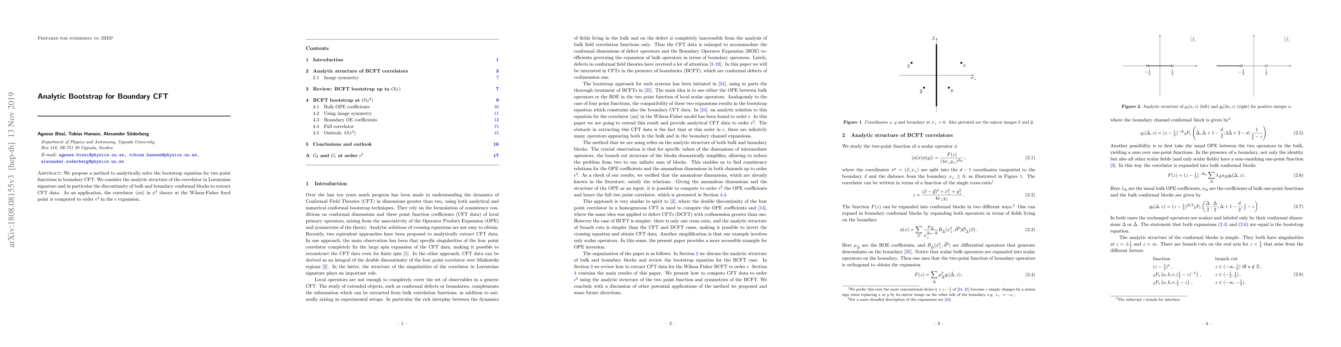 We propose a method to analytically solve the bootstrap equation for two point functions in boundary CFT. We consider the analytic structure of the correlator in Lorentzian signature and in particular the discontinuity of bulk and boundary conformal blocks to extract CFT data. As an application, the correlator $\langle \phi \phi \rangle$ in $\phi^4$ theory at the Wilson-Fisher fixed point is computed to order $\epsilon^2$ in the $\epsilon$ expansion.