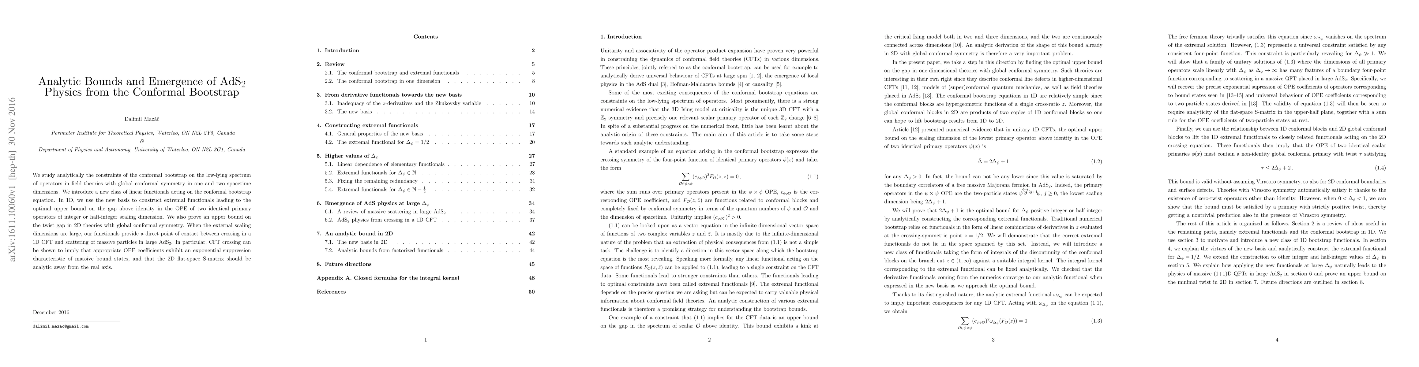 We study analytically the constraints of the conformal bootstrap on the low-lying spectrum of operators in field theories with global conformal symmetry in one and two spacetime dimensions. We introduce a new class of linear functionals acting on the conformal bootstrap equation. In 1D, we use the new basis to construct extremal functionals leading to the optimal upper bound on the gap above identity in the OPE of two identical primary operators of integer or half-integer scaling dimension. We also prove an upper bound on the twist gap in 2D theories with global conformal symmetry. When the external scaling dimensions are large, our functionals provide a direct point of contact between crossing in a 1D CFT and scattering of massive particles in large $\textrm{AdS}_2$. In particular, CFT crossing can be shown to imply that appropriate OPE coefficients exhibit an exponential suppression characteristic of massive bound states, and that the 2D flat-space S-matrix should be analytic away from the real axis.