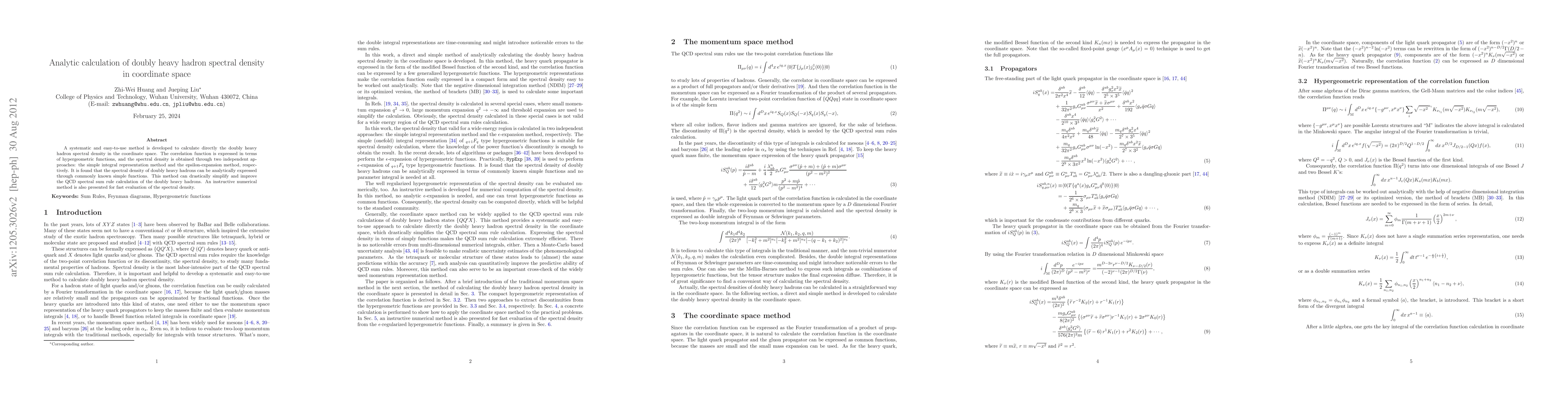 A systematic and easy-to-use method is developed to calculate directly the doubly heavy hadron spectral density in the coordinate space. The correlation function is expressed in terms of hypergeometric functions, and the spectral density is obtained through two independent approaches: the simple integral representation method and the epsilon-expansion method, respectively. It is found that the spectral density of doubly heavy hadrons can be analytically expressed through commonly known simple functions. This method can drastically simplify and improve the QCD spectral sum rule calculation of the doubly heavy hadrons. An instructive numerical method is also presented for fast evaluation of the spectral density.
