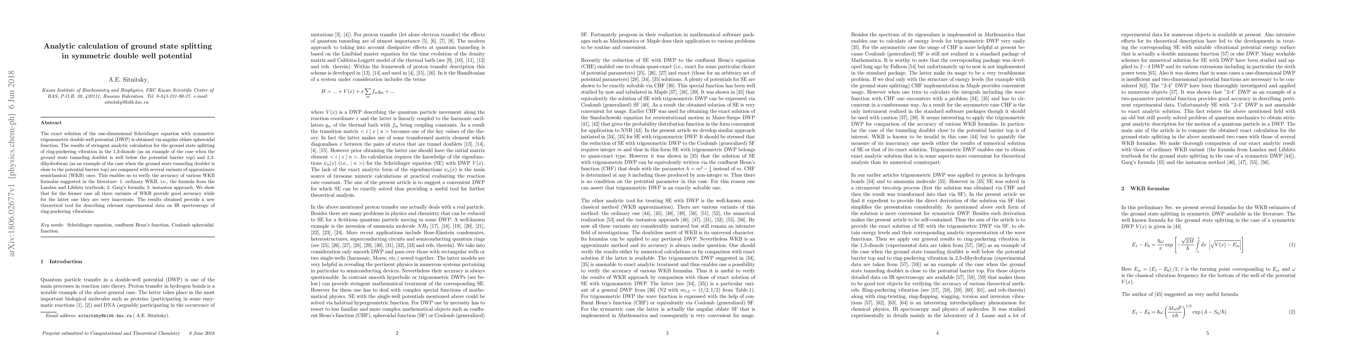 This paper provides an exact analytic solution for the ground state splitting in symmetric double-well potentials using angular oblate spheroidal functions, and compares these results with various WKB approximations, showing that while the WKB methods are accurate for certain cases, they fail for others. The findings offer a new theoretical tool for interpreting IR spectroscopy data on ring-puckering vibrations.