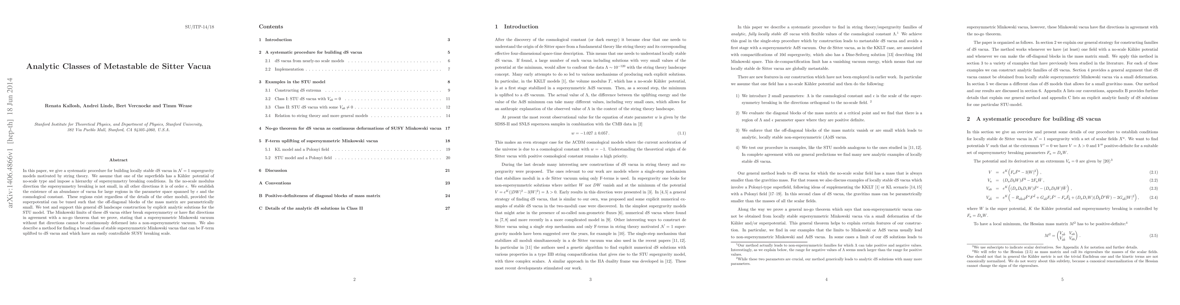 In this paper, we give a systematic procedure for building locally stable dS vacua in $\mathcal{N}=1$ supergravity models motivated by string theory. We assume that one of the superfields has a Kahler potential of no-scale type and impose a hierarchy of supersymmetry breaking conditions. In the no-scale modulus direction the supersymmetry breaking is not small, in all other directions it is of order $\epsilon$. We establish the existence of an abundance of vacua for large regions in the parameter space spanned by $\epsilon$ and the cosmological constant. These regions exist regardless of the details of the other moduli, provided the superpotential can be tuned such that the off-diagonal blocks of the mass matrix are parametrically small. We test and support this general dS landscape construction by explicit analytic solutions for the STU model. The Minkowski limits of these dS vacua either break supersymmetry or have flat directions in agreement with a no-go theorem that we prove, stating that a supersymmetric Minkowski vacuum without flat directions cannot be continuously deformed into a non-supersymmetric vacuum. We also describe a method for finding a broad class of stable supersymmetric Minkowski vacua that can be F-term uplifted to dS vacua and which have an easily controllable SUSY breaking scale.