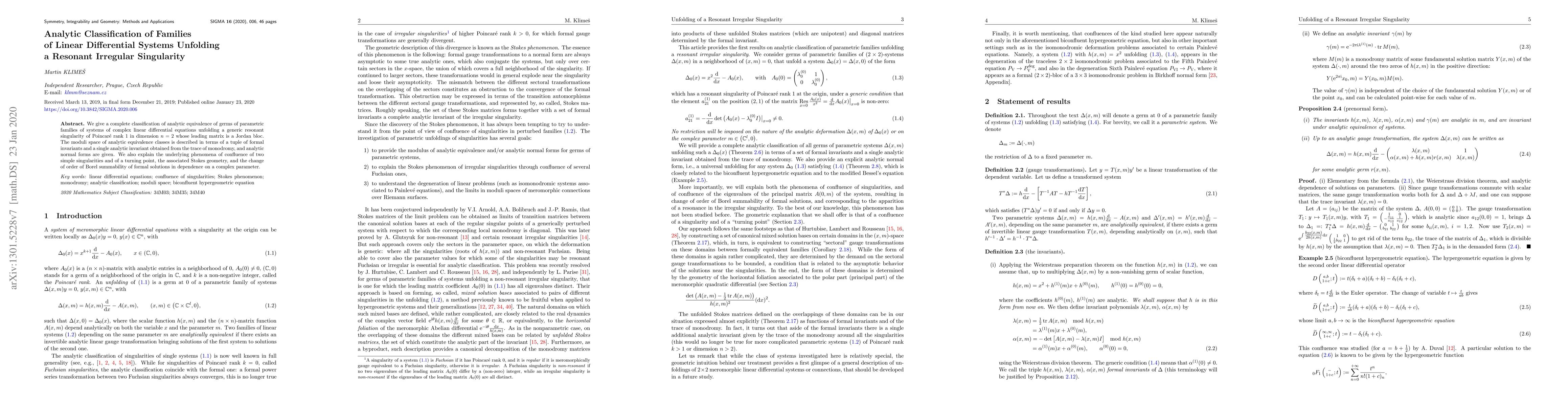 We give a complete classification of analytic equivalence of germs of parametric families of systems of complex linear differential equations unfolding a generic resonant singularity of Poincare rank 1 in dimension $n = 2$ whose leading matrix is a Jordan bloc. The moduli space of analytic equivalence classes is described in terms of a tuple of formal invariants and a single analytic invariant obtained from the trace of monodromy, and analytic normal forms are given. We also explain the underlying phenomena of confluence of two simple singularities and of a turning point, the associated Stokes geometry, and the change of order of Borel summability of formal solutions in dependence on a complex parameter.