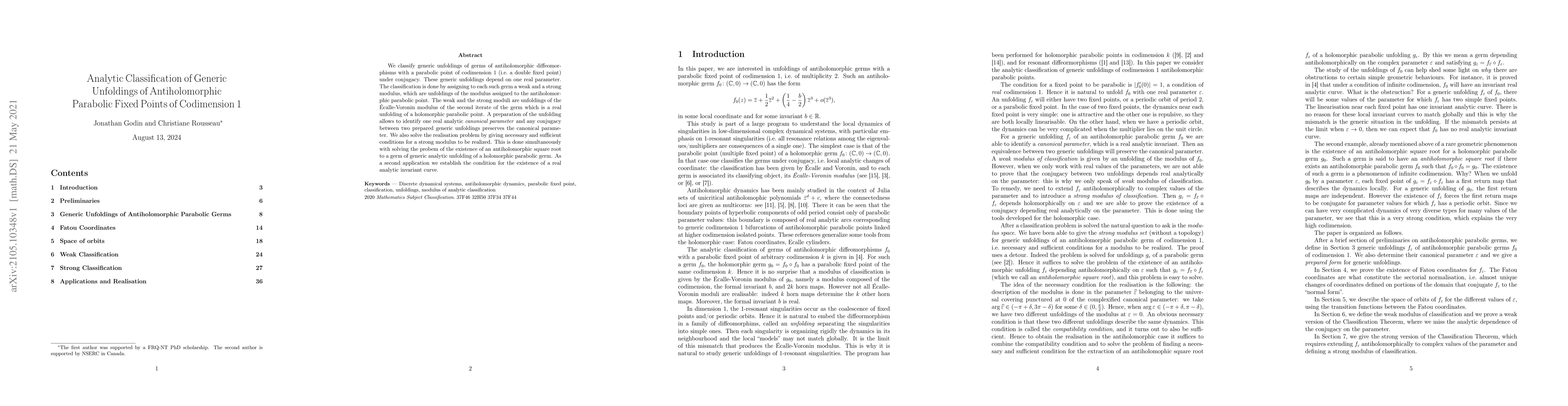 This research classifies generic unfoldings of antiholomorphic parabolic fixed points of codimension 1 through a real parameter, assigning weak and strong moduli. It provides necessary and sufficient conditions for realizing these moduli and addresses the existence of antiholomorphic square roots and real analytic invariant curves.