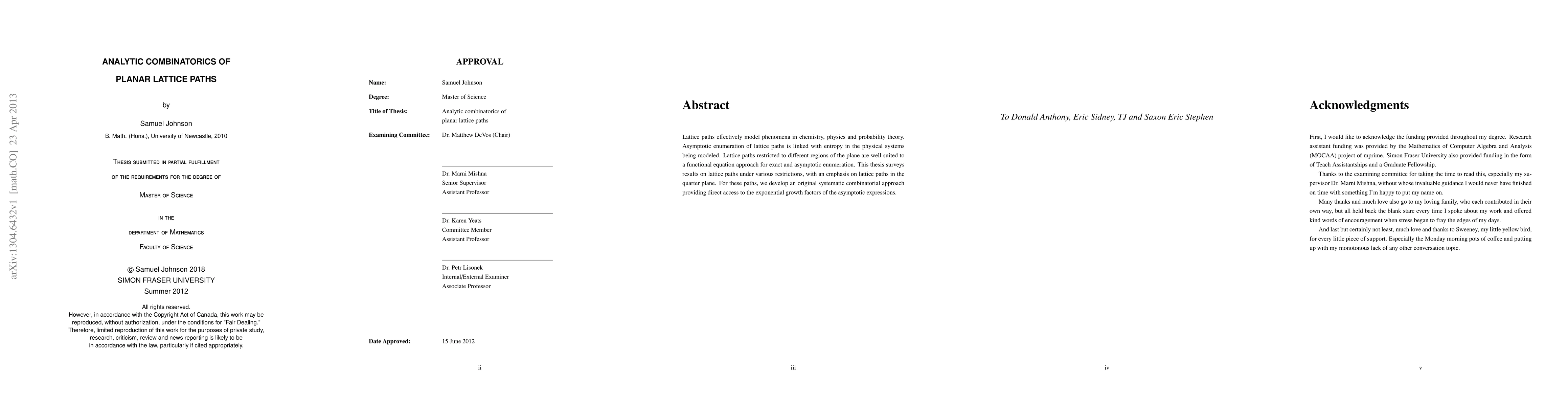 This paper surveys analytic combinatorics of planar lattice paths, focusing on enumeration under various restrictions, particularly in the quarter plane, and develops a novel combinatorial approach to determine the exponential growth factors of their asymptotic expressions.