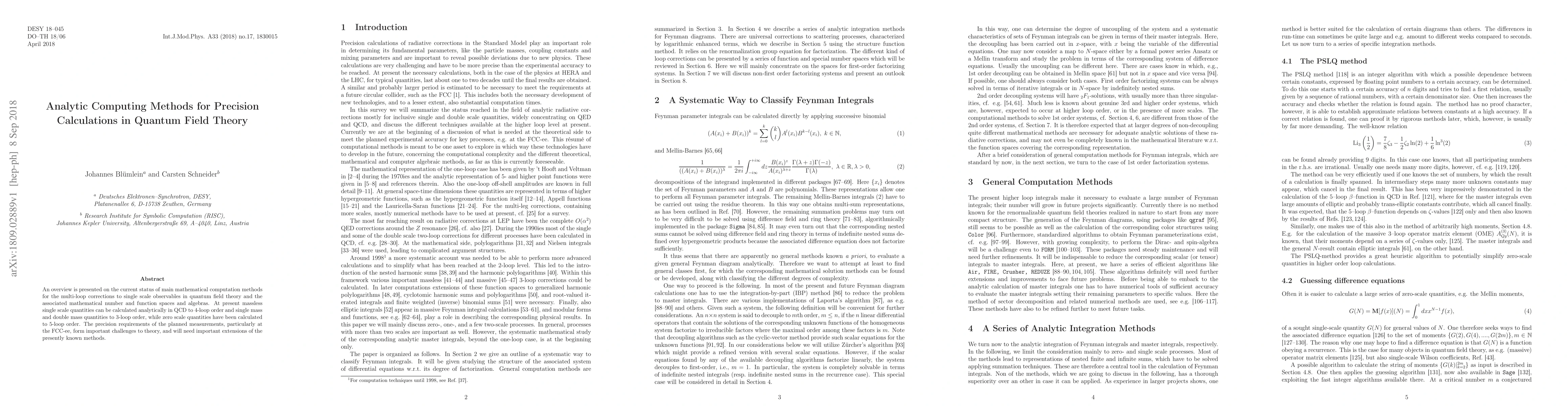 An overview is presented on the current status of main mathematical computation methods for the multi-loop corrections to single scale observables in quantum field theory and the associated mathematical number and function spaces and algebras. At present massless single scale quantities can be calculated analytically in QCD to 4-loop order and single mass and double mass quantities to 3-loop order, while zero scale quantities have been calculated to 5-loop order. The precision requirements of the planned measurements, particularly at the FCC-ee, form important challenges to theory, and will need important extensions of the presently known methods.