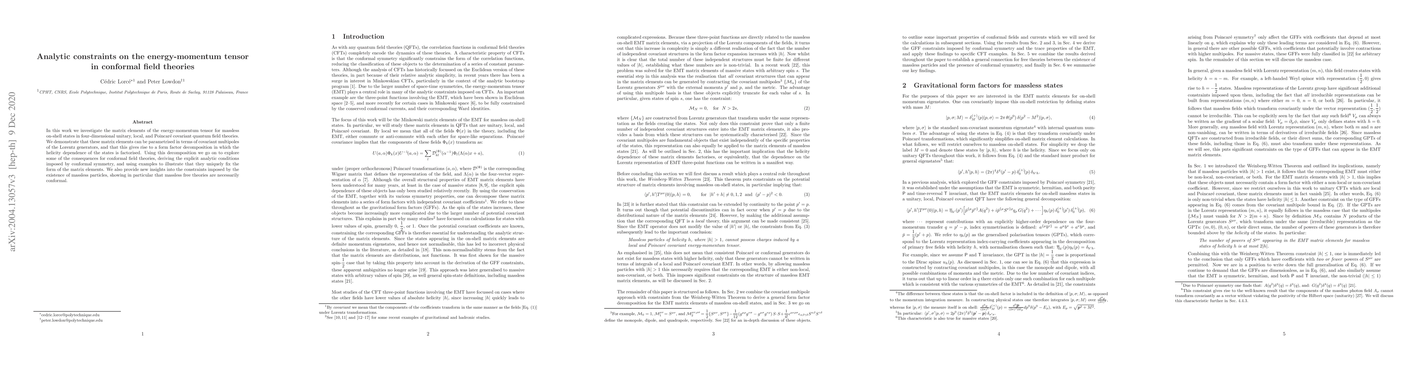 In this work we investigate the matrix elements of the energy-momentum tensor for massless on-shell states in four-dimensional unitary, local, and Poincar\'e covariant quantum field theories. We demonstrate that these matrix elements can be parametrised in terms of covariant multipoles of the Lorentz generators, and that this gives rise to a form factor decomposition in which the helicity dependence of the states is factorised. Using this decomposition we go on to explore some of the consequences for conformal field theories, deriving the explicit analytic conditions imposed by conformal symmetry, and using examples to illustrate that they uniquely fix the form of the matrix elements. We also provide new insights into the constraints imposed by the existence of massless particles, showing in particular that massless free theories are necessarily conformal.