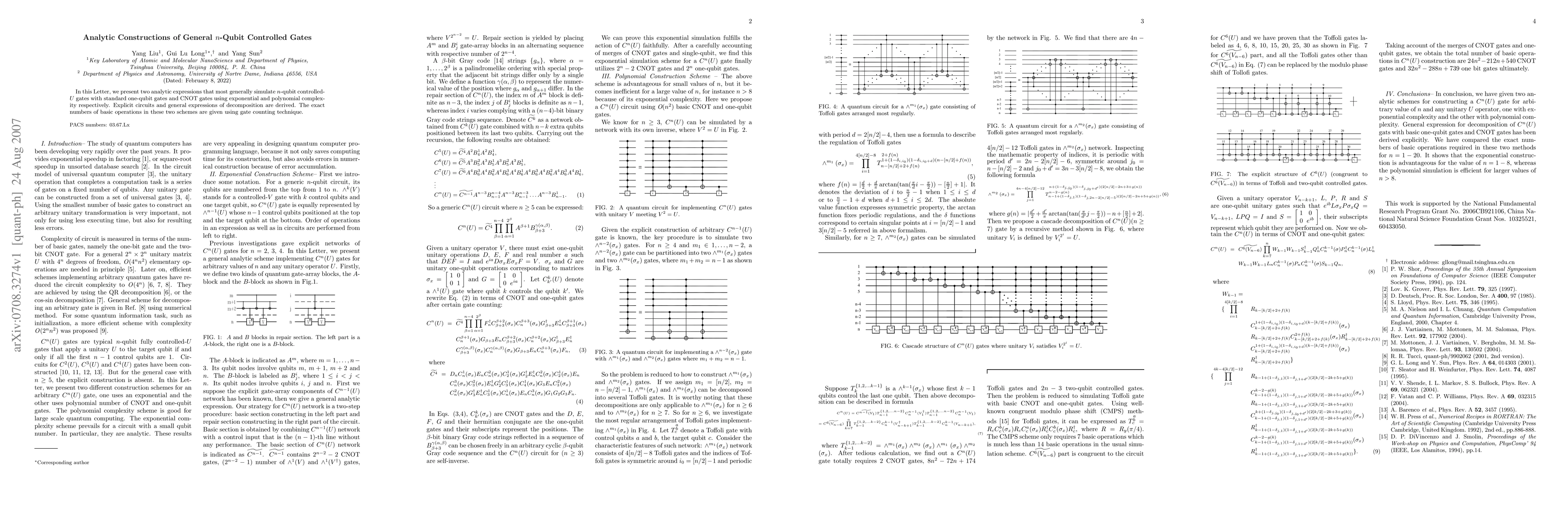 In this Letter, we present two analytic expressions that most generally simulate $n$-qubit controlled-$U$ gates with standard one-qubit gates and CNOT gates using exponential and polynomial complexity respectively. Explicit circuits and general expressions of decomposition are derived. The exact numbers of basic operations in these two schemes are given using gate counting technique.