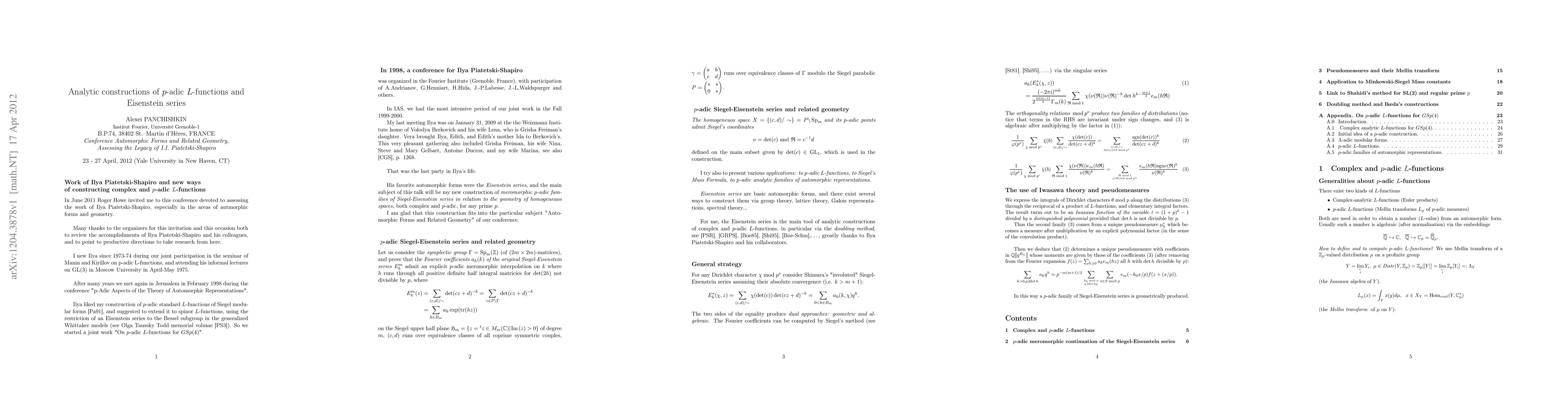 The Fourier coefficients of the Siegel-Eisenstein series are p-adically continued for all primes p, as meromorphic functions, using the reciprocal of a product of L-functions. A construction of p-adic meromorphic families of such series is given in relation to the geometry of homogeneous spaces. Applications are given to p-adic L-functions, to Siegel's Mass Formula, to p-adic analytic families of automorphic representations. Based on author's talk for the Conference Automorphic Forms and Related Geometry, Assessing the Legacy of I.I. Piatetski-Shapiro