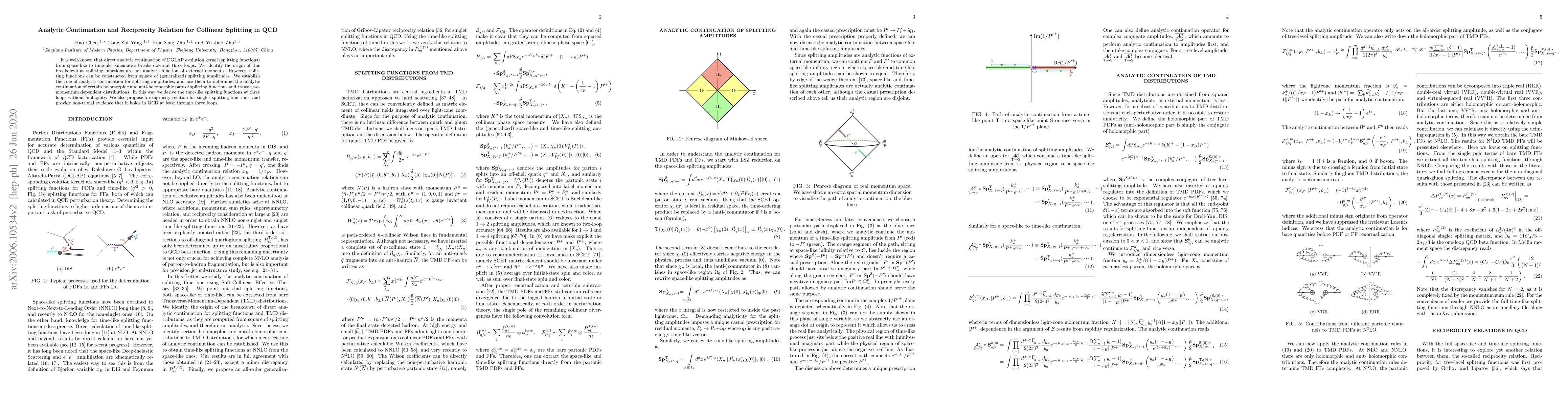 It is well-known that direct analytic continuation of DGLAP evolution kernel (splitting functions) from space-like to time-like kinematics breaks down at three loops. We identify the origin of this breakdown as splitting functions are not analytic function of external momenta. However, splitting functions can be constructed from square of (generalized) splitting amplitudes. We establish the rule of analytic continuation for splitting amplitudes, and use them to determine the analytic continuation of certain holomorphic and anti-holomorphic part of splitting functions and transverse-momentum dependent distributions. In this way we derive the time-like splitting functions at three loops without ambiguity. We also propose a reciprocity relation for singlet splitting functions, and provide non-trivial evidence that it holds in QCD at least through three loops.