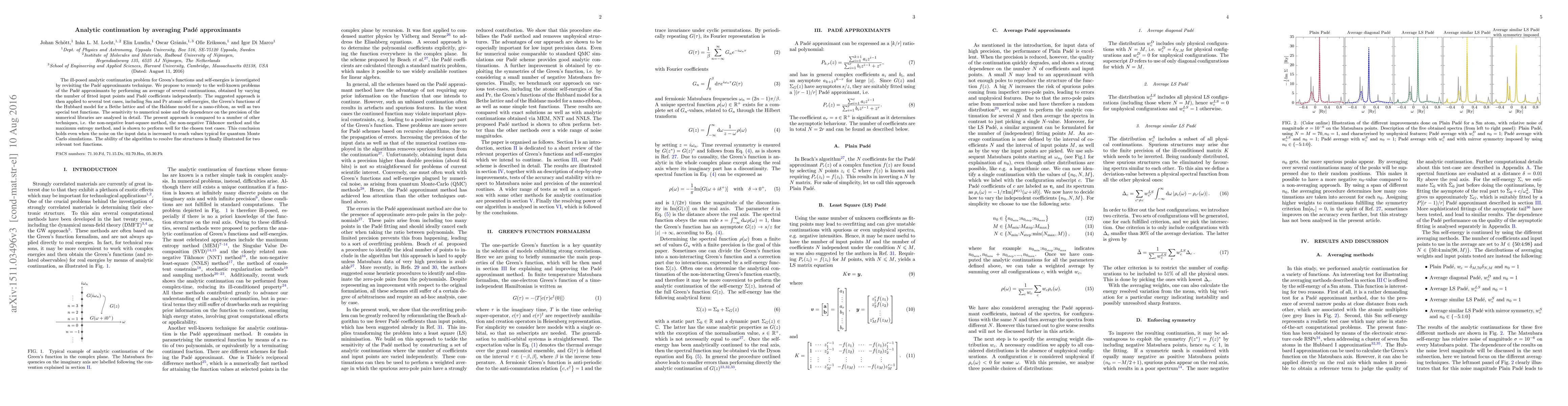 This paper proposes an averaging method for Padé approximants to improve analytic continuation of Green's functions and self-energies, demonstrating its effectiveness through various test cases and comparing it favorably against other techniques, even under noisy conditions. The method shows good resolution of fine structures and is robust to numerical noise.