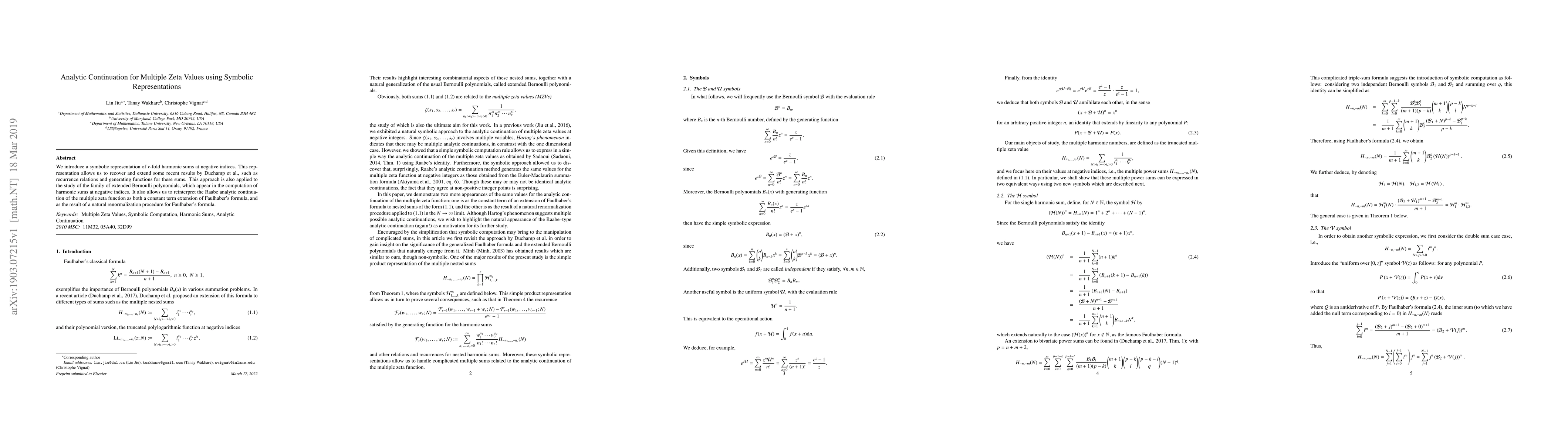 This paper presents a symbolic representation for $r$-fold harmonic sums at negative indices, extending recent results on recurrence relations and generating functions. It also reinterprets the Raabe analytic continuation of the multiple zeta function through Faulhaber's formula and a natural renormalization procedure.