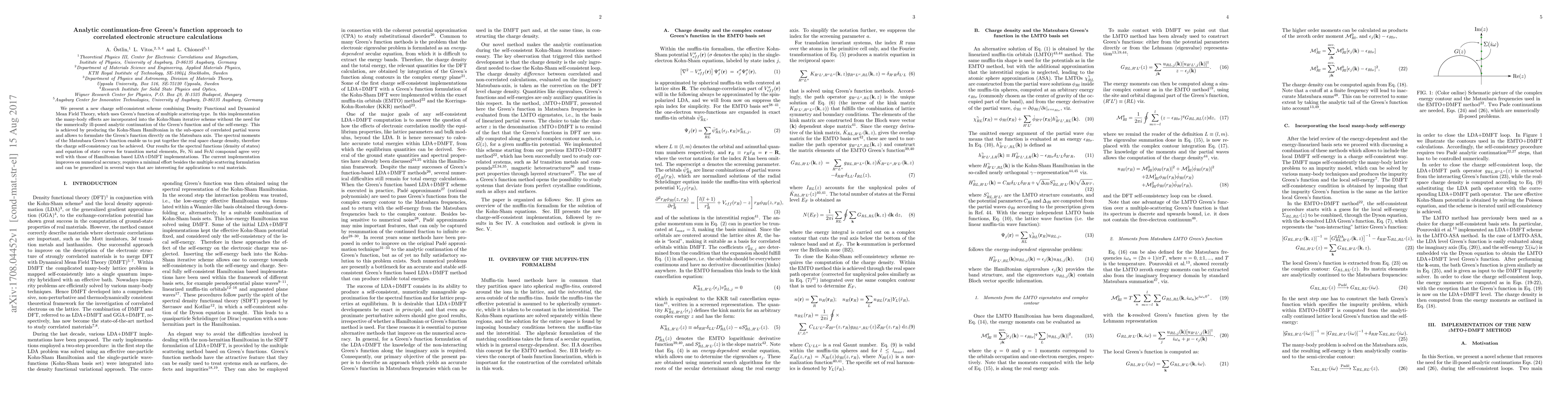 We present a new charge self-consistent scheme combining Density Functional and Dynamical Mean Field Theory, which uses Green's function of multiple scattering-type. In this implementation the many-body effects are incorporated into the Kohn-Sham iterative scheme without the need for the numerically ill-posed analytic continuation of the Green's function and of the self-energy. This is achieved by producing the Kohn-Sham Hamiltonian in the sub-space of correlated partial waves and allows to formulate the Green's function directly on the Matsubara axis. The spectral moments of the Matsubara Green's function enable us to put together the real space charge density, therefore the charge self-consistency can be achieved. Our results for the spectral functions (density of states) and equation of state curves for transition metal elements, Fe, Ni and FeAl compound agree very well with those of Hamiltonian based LDA+DMFT implementations. The current implementation improves on numerical accuracy, requires a minimal effort besides the multiple scattering formulation and can be generalized in several ways that are interesting for applications to real materials.