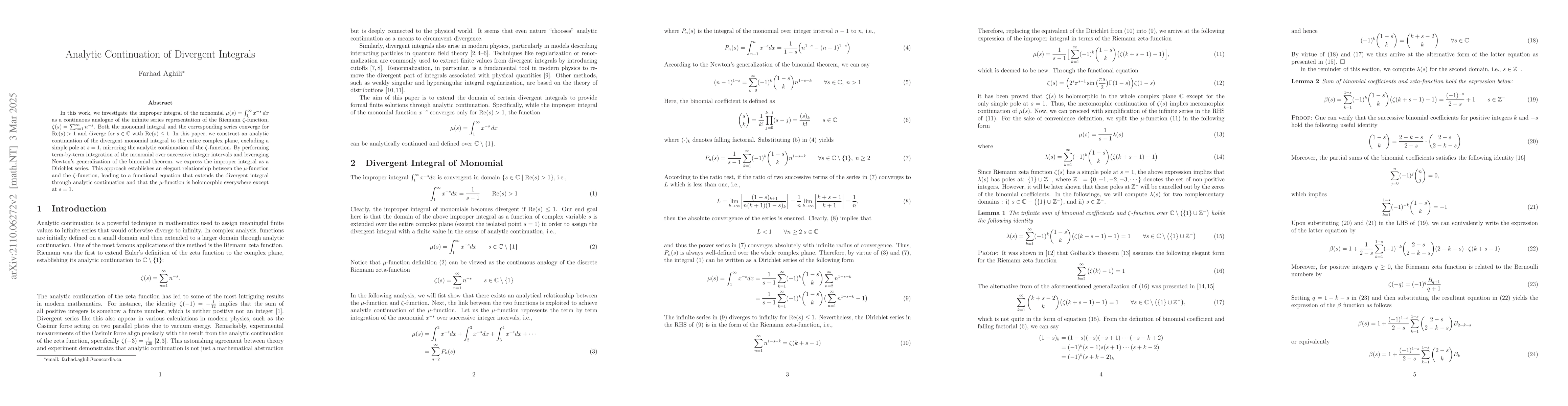 This paper explores the analytic continuation of the divergent integral $\mu(s) = \int_1^{\infty} x^{-s} dx$, establishing a relationship between it and the Riemann zeta function $\zeta(s)$. The integral is shown to be equivalent to a Dirichlet series via term-by-term integration and the Newton's binomial theorem, leading to a functional equation and a meaningful solution for the divergent integral.