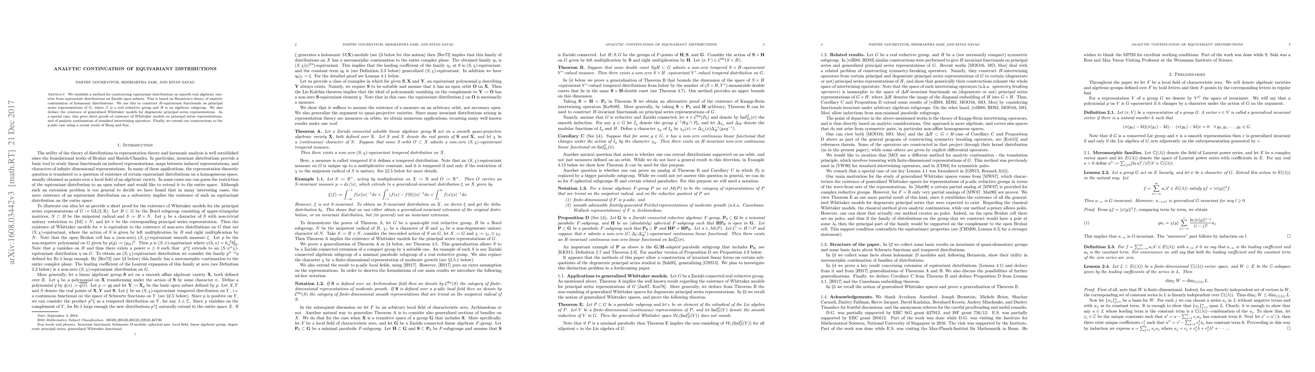 This paper develops a method for constructing equivariant distributions on smooth algebraic varieties via analytic continuation, leveraging Bernstein's theory. It applies this to construct $H$-equivariant functionals on $G$'s principal series representations, proving the existence of generalized Whittaker models and extending the results to the $p$-adic setting.