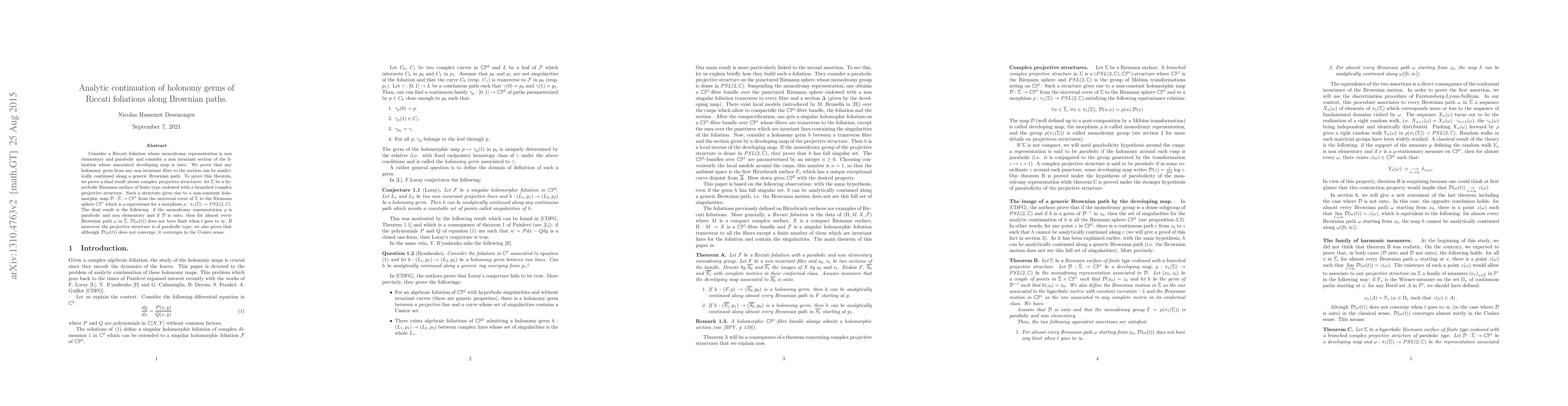 This paper deals with the question of analytic continuation of holonomy germs of holomorphic foliations. We prove that for a quasi-minimal Riccati foliation of the complex projective plane, any holonomy germ of the foliation between complex projective lines can be analytically continued along a generic Brownian path.