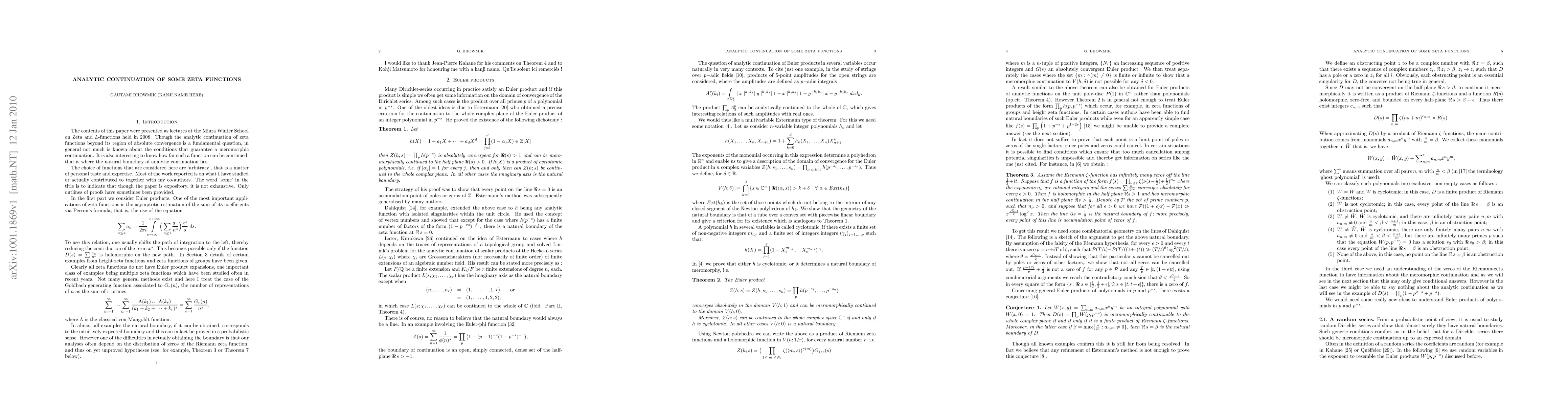 This is an expository paper on the meromorphic continuation of zeta functions with Euler products (for example zeta functions of groups and height zeta functions) or without (for example the Goldbach zeta function). As an application we show how a natural boundary of analytic continuation can give asymptotic results.