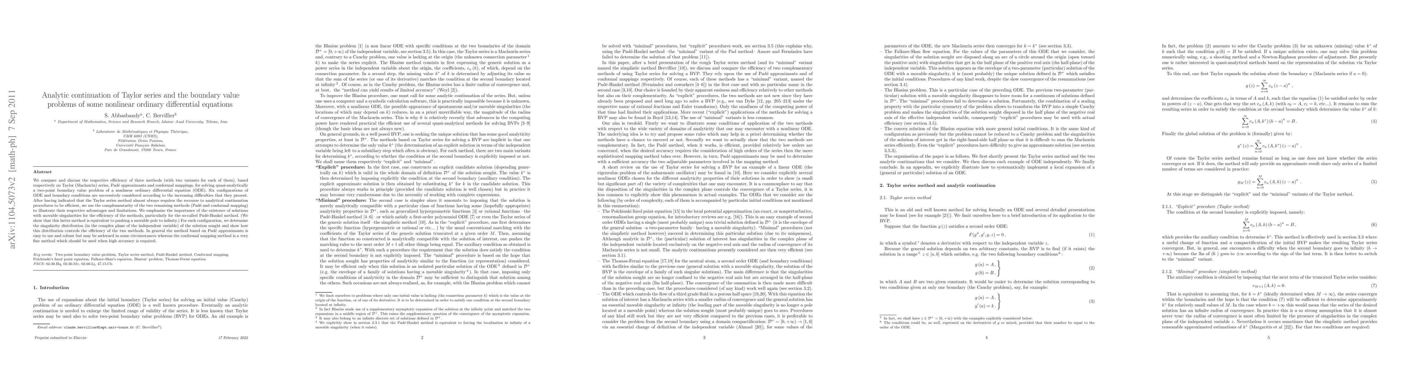 Researchers compared three methods for solving two-point boundary value problems of nonlinear ODEs: Taylor series, Padé approximants, and conformal mappings. They found that the Padé approximation method is robust but may be awkward in some cases, while the conformal mapping method offers high accuracy but requires careful consideration of solution singularities.