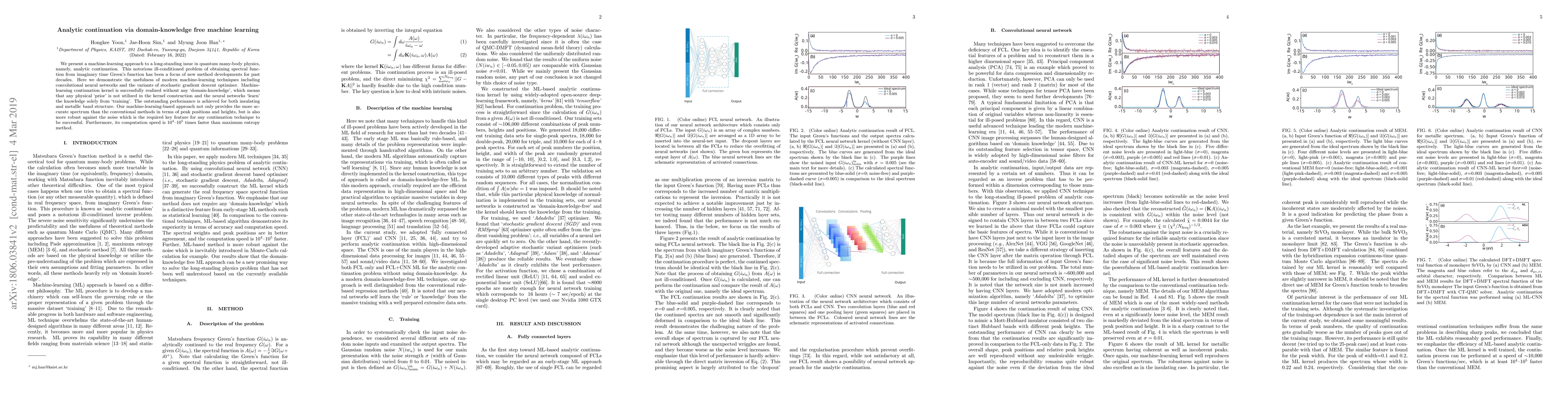 We present a machine-learning approach to a long-standing issue in quantum many-body physics, namely, analytic continuation. This notorious ill-conditioned problem of obtaining spectral function from imaginary time Green's function has been a focus of new method developments for past decades. Here we demonstrate the usefulness of modern machine-learning techniques including convolutional neural networks and the variants of stochastic gradient descent optimiser. Machine-learning continuation kernel is successfully realized without any 'domain-knowledge', which means that any physical 'prior' is not utilized in the kernel construction and the neural networks 'learn' the knowledge solely from 'training'. The outstanding performance is achieved for both insulating and metallic band structure. Our machine-learning-based approach not only provides the more accurate spectrum than the conventional methods in terms of peak positions and heights, but is also more robust against the noise which is the required key feature for any continuation technique to be successful. Furthermore, its computation speed is 10$^4$-10$^5$ times faster than maximum entropy method.