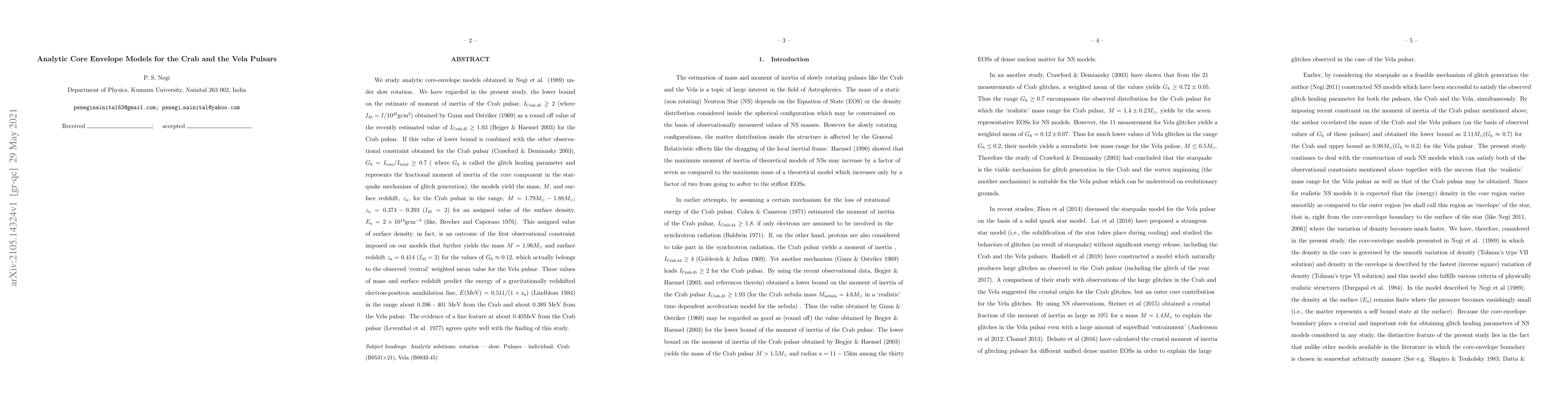 We study analytic core-envelope models obtained in Negi et al. (1989) under slow rotation. We have regarded in the present study, the lower bound on the estimate of moment of inertia of the Crab pulsar, $I_{\rm Crab,45} \geq 2$ (where $I_{45}=I/10^{45}\rm g{cm}^2$) obtained by Gunn and Ostriker (1969) as a round off value of the recently estimated value of $I_{\rm Crab,45} \geq 1.93$ (Bejger \& Haensel 2003) for the Crab pulsar. If this value of lower bound is combined with the other observational constraint obtained for the Crab pulsar (Crawford \& Demiansky 2003), $G_h = I_{\rm core}/I_{\rm total} \geq 0.7$ ( where $G_h$ is called the glitch healing parameter and represents the fractional moment of inertia of the core component in the starquake mechanism of glitch generation), the models yield the mass, $M$, and surface redshift, $z_a$, for the Crab pulsar in the range, $M = 1.79M_\odot - 1.88M_\odot$; $z_a = 0.374 - 0.393$ ($I_{45} = 2$) for an assigned value of the surface density, $E_a = 2\times 10^{14}\rm g{cm}^{-3}$ (like, Brecher and Caporaso 1976). This assigned value of surface density, in fact, is an outcome of the first observational constraint imposed on our models that further yields the mass $M = 1.96M_\odot $ and surface redshift $z_a=$ 0.414 ($I_{45}= 2$) for the values of $G_h \approx 0.12$, which actually belongs to the observed `central' weighted mean value for the Vela pulsar. These values of mass and surface redshift predict the energy of a gravitationally redshifted electron-positron annihilation line, $E (\rm {MeV}) = 0.511/(1+z_a)$ (Lindblom 1984) in the range about 0.396 - 401 MeV from the Crab and about 0.389 MeV from the Vela pulsar. The evidence of a line feature at about 0.40MeV from the Crab pulsar (Leventhal et al. 1977) agrees quite well with the finding of this study.