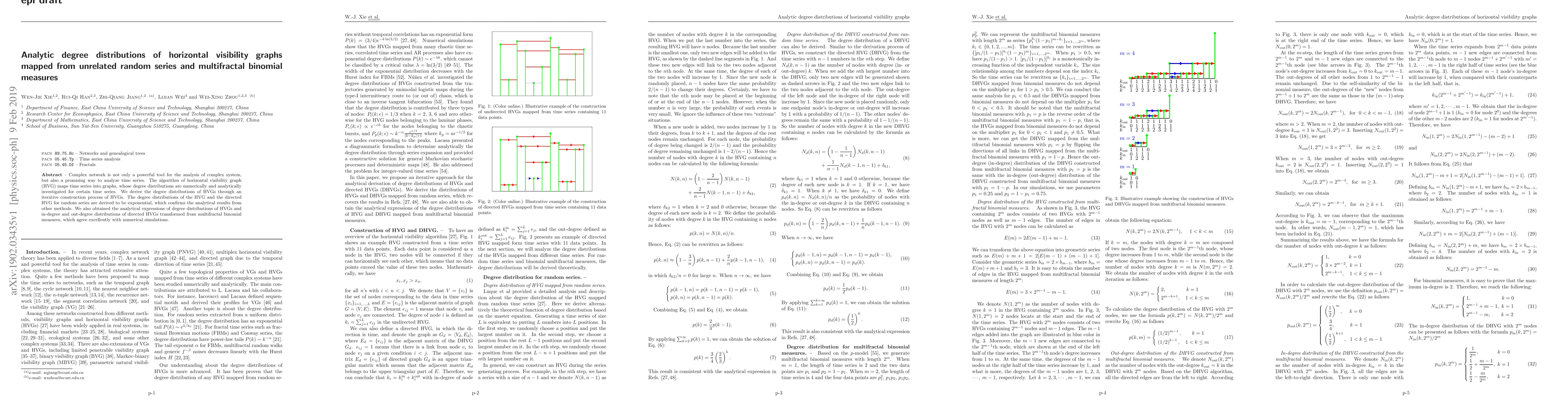 This paper investigates the degree distributions of horizontal visibility graphs (HVGs) derived from random series and multifractal binomial measures. The authors analytically derive exponential degree distributions for HVGs from random series and obtain expressions for HVGs from multifractal binomial measures, which align well with numerical simulations.