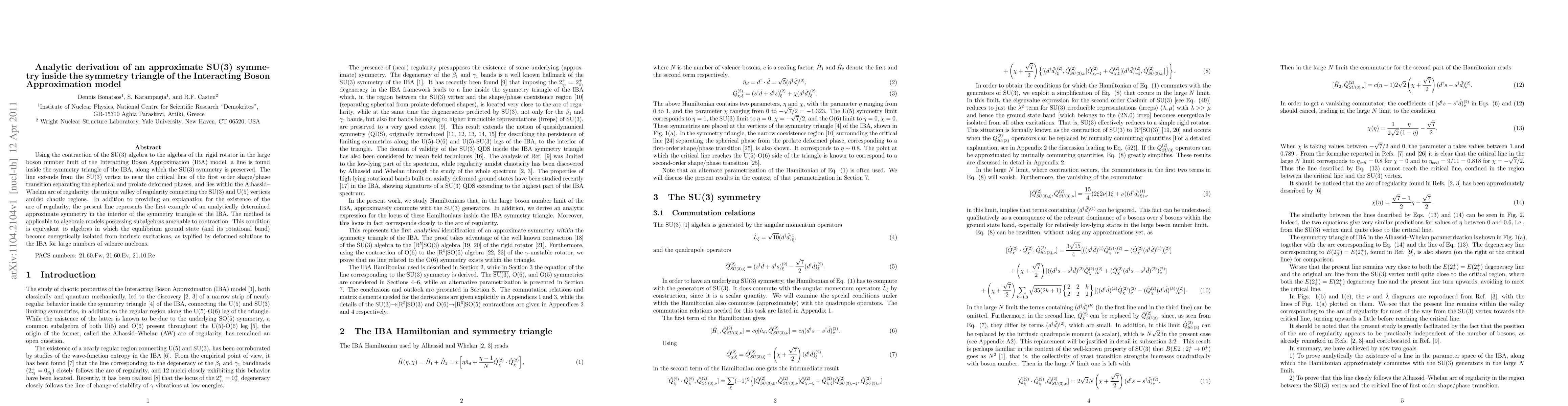 This paper analytically derives an approximate SU(3) symmetry line within the Interacting Boson Approximation (IBA) model's symmetry triangle, extending from the SU(3) vertex towards the shape phase transition. This line explains the existence of the Alhassid--Whelan arc of regularity and is the first analytically determined symmetry in the IBA's interior.