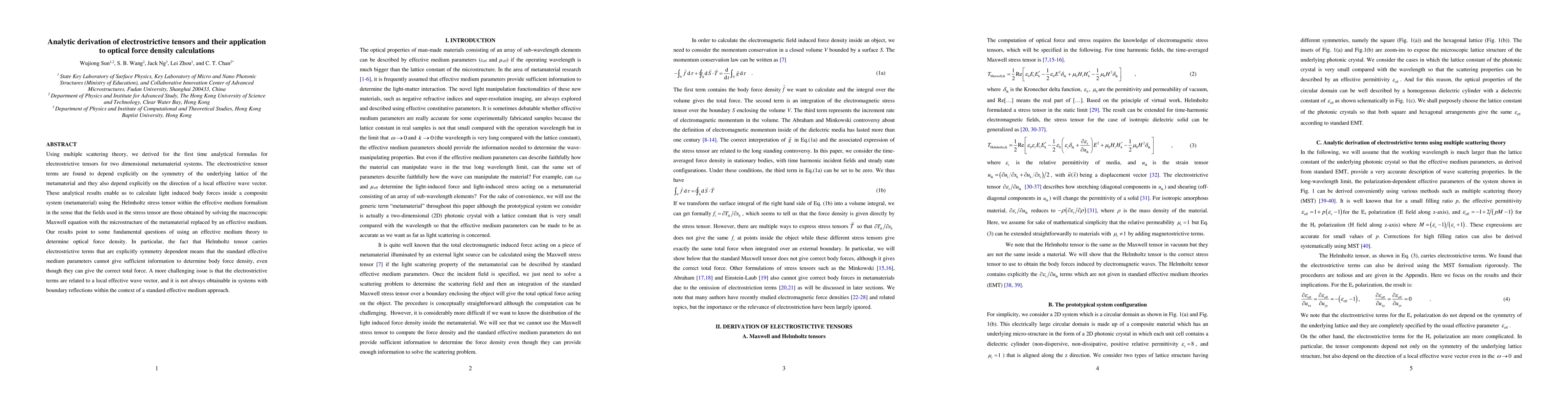 This paper derives analytical formulas for electrostrictive tensors in 2D metamaterial systems using multiple scattering theory, revealing their dependence on lattice symmetry and local effective wave vectors. The findings enable precise calculations of light-induced body forces within composite systems, highlighting limitations of effective medium theory in determining optical force density due to symmetry-dependent electrostrictive terms and challenges in obtaining local effective wave vectors.