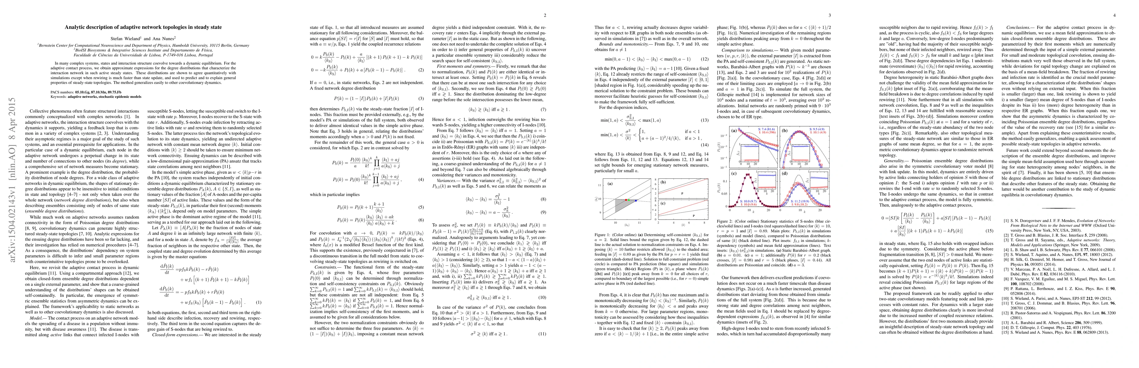 Researchers developed a method to describe adaptive network topologies in steady state, finding approximate expressions for degree distributions that agree with simulations except when rewiring is fast.