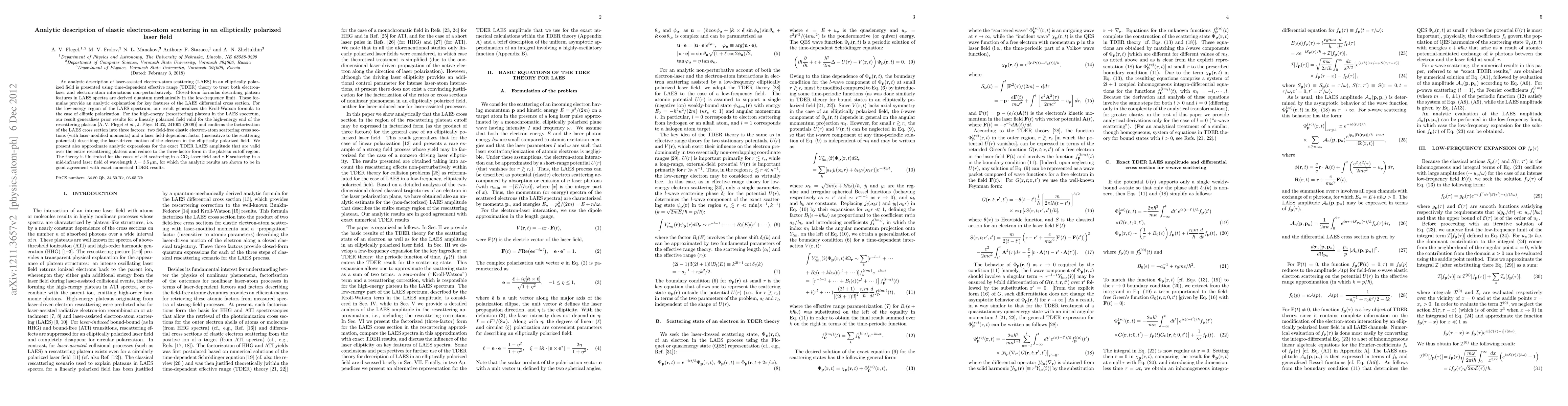 This paper presents an analytic theory for elastic electron-atom scattering in an elliptically polarized laser field using time-dependent effective range theory. It derives closed-form formulas for LAES spectra and generalizes prior results for linearly polarized fields, confirming the factorization of the LAES cross section and providing good agreement with numerical calculations for $e$-H and $e$-F scattering scenarios.