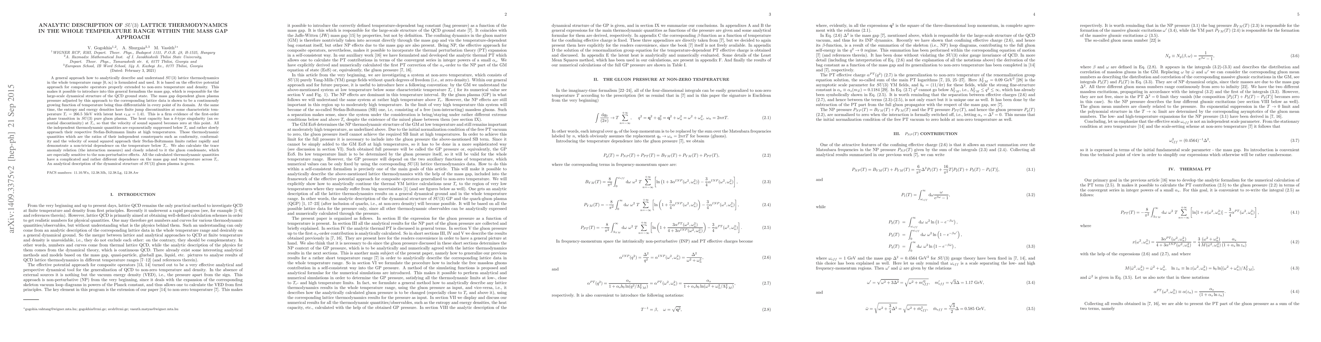 A general approach how to analytically describe and understand $SU(3)$ lattice thermodynamics in the whole temperature range $[0, \infty)$ is formulated and used. It is based on the effective potential approach for composite operators properly extended to non-zero temperature and density. This makes it possible to introduce into this general formalism the mass gap, which is responsible for the large-scale dynamical structure of the QCD ground state. The mass gap dependent gluon plasma pressure adjusted by this approach to the corresponding lattice data is shown to be a continuously growing function of temperature being thus differentiable in every point of its domain. At the same time, the entropy and energy densities have finite jump discontinuities at some characteristic temperature $T_c = 266.5 \ \MeV$ with latent heat $\epsilon_{LH}= 1.41$. This is a firm evidence of the first-order phase transition in $SU(3)$ pure gluon plasma. The heat capacity has a $\delta$-type singularity (an essential discontinuity) at $T_c$, so that the velocity of sound squared becomes zero at this point. All the independent thermodynamic quantities are exponentially suppressed below $T_c$ and rather slowly approach their respective Stefan-Boltzmann limits at high temperatures. Those thermodynamic quantities which are the ratios of their independent counterparts such as conformity, conformality and the velocity of sound squared approach their Stefan-Boltzmann limits rather rapidly and demonstrate a non-trivial dependence on the temperature below $T_c$. We also calculate the trace anomaly relation (the interaction measure) and closely related to it the gluon condensate, which are especially sensitive to the non-perturbative effects. An analytical description of the dynamical structure of $SU(3)$ gluon plasma is given.