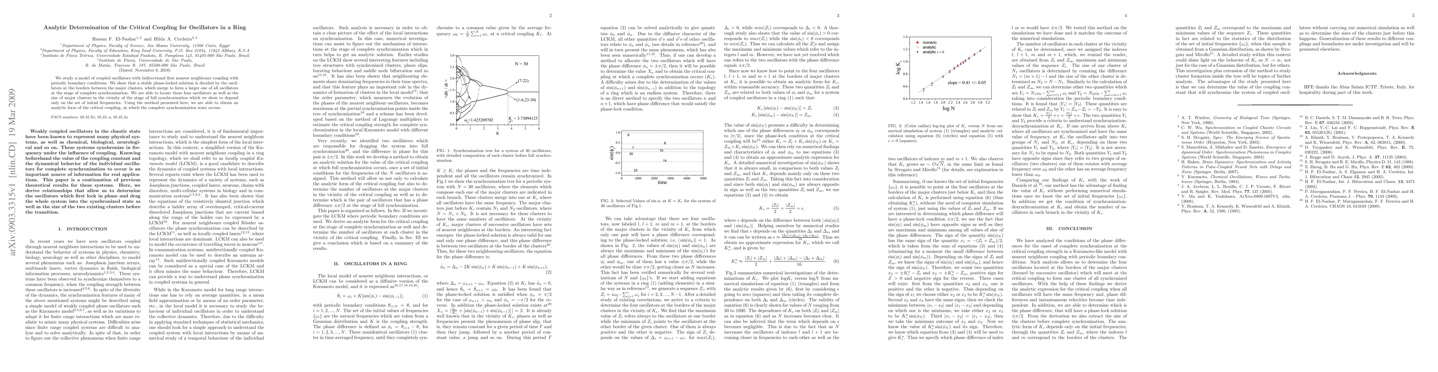 We study a model of coupled oscillators with bidirectional first nearest neighbours coupling with periodic boundary conditions. We show that a stable phase-locked solution is decided by the oscillators at the borders between the major clusters, which merge to form a larger one of all oscillators at the stage of complete synchronization. We are able to locate these four oscillators as well as the size of major clusters in the vicinity of the stage of full synchronization which we show to depend only on the set of initial frequencies. Using the method presented here, we are able to obtain an analytic form of the critical coupling, at which the complete synchronization state occurs.