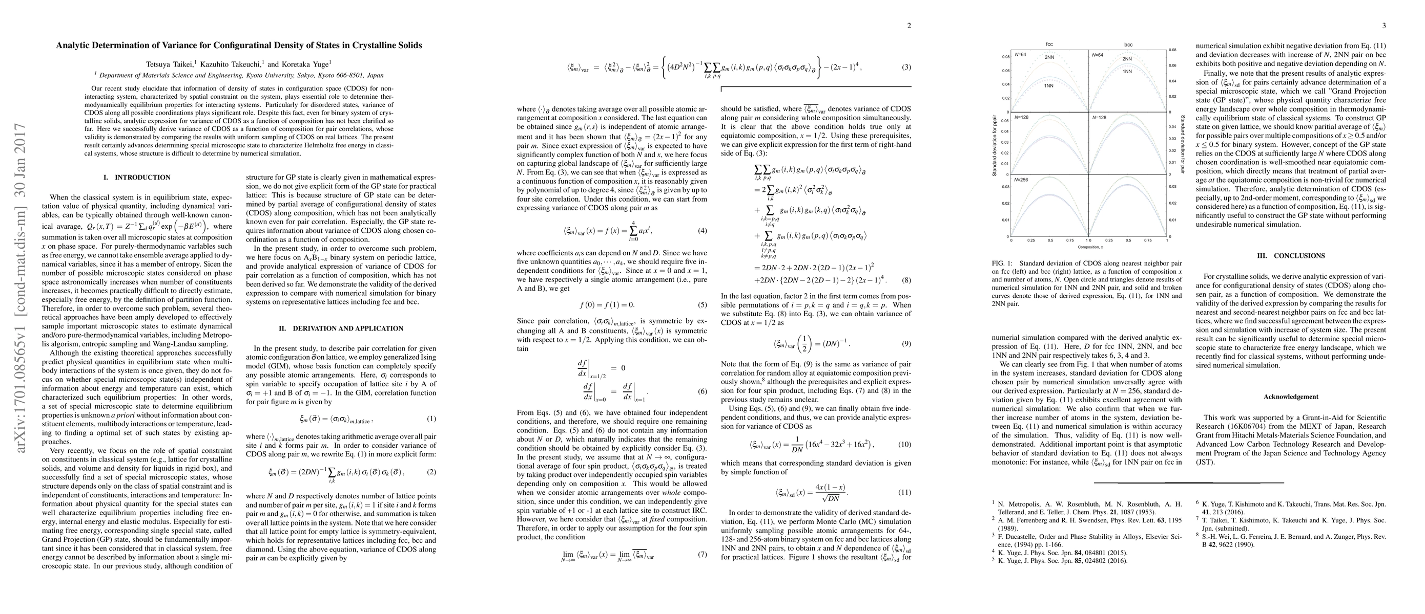 This paper derives an analytic expression for the variance of the configurational density of states (CDOS) in crystalline solids as a function of composition, crucial for understanding thermodynamic equilibrium properties in interacting systems. The derived expression for pair correlations is validated through comparison with uniform sampling on real lattices, aiding in characterizing Helmholtz free energy in classical systems.