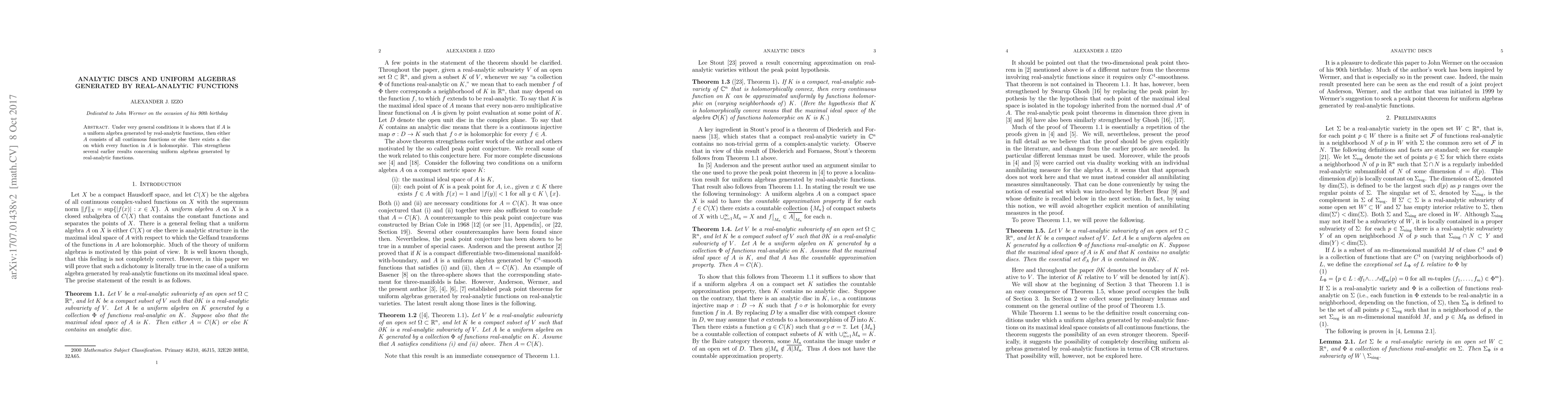 This paper demonstrates that under general conditions, a uniform algebra generated by real-analytic functions either comprises all continuous functions or possesses a disc where all functions in the algebra are holomorphic. This finding enhances previous results on such uniform algebras.