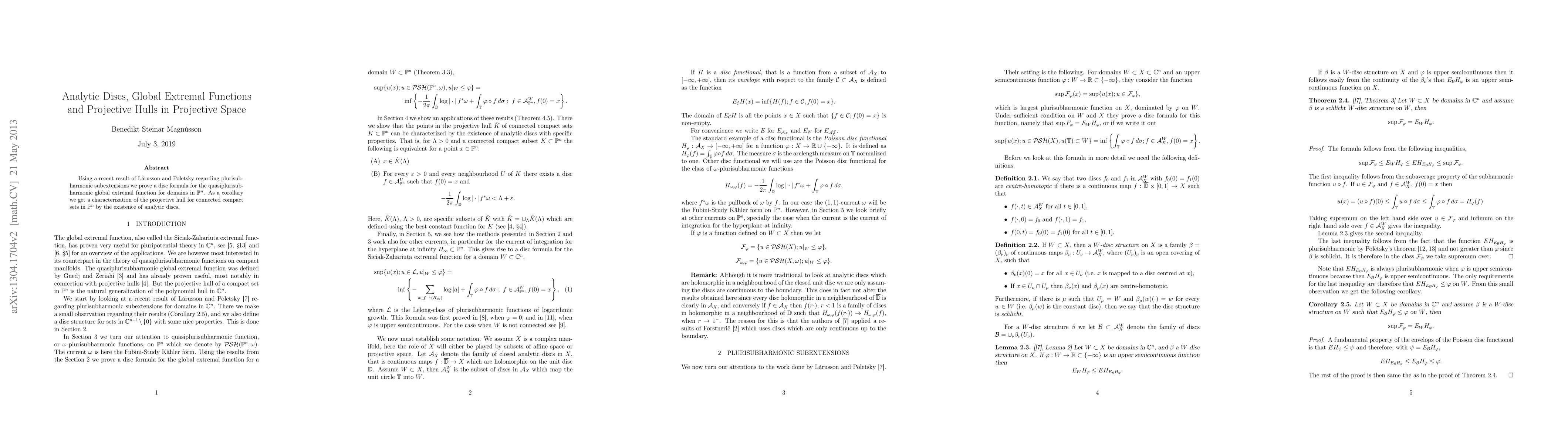 This paper proves a disc formula for the quasiplurisubharmonic global extremal function in complex projective space using results on plurisubharmonic subextensions. It also characterizes the projective hull for connected compact sets via the existence of analytic discs.