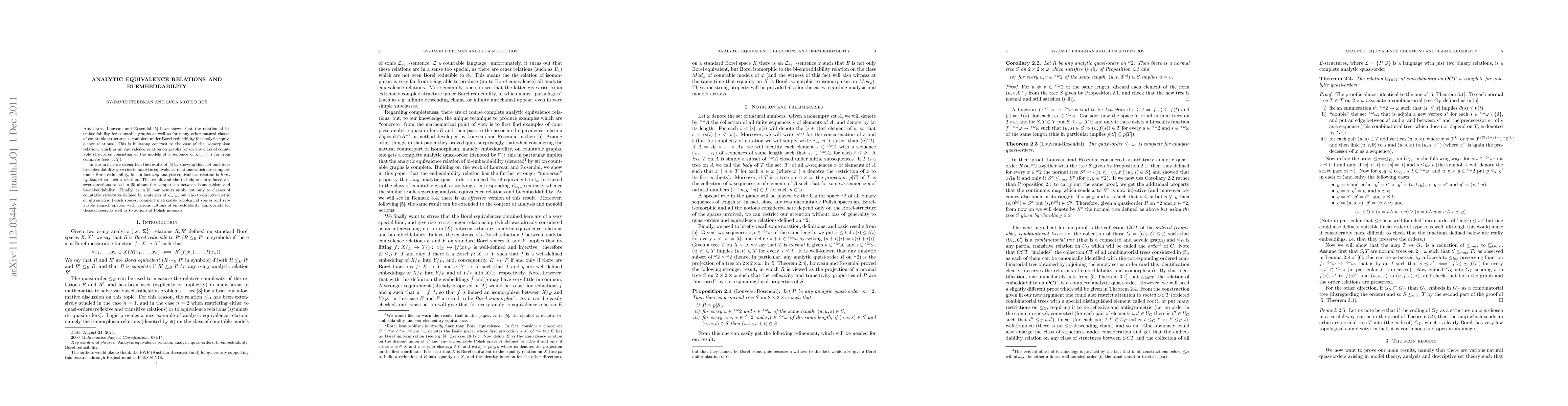 This paper strengthens results showing that bi-embeddability relations for countable structures are complete under Borel reducibility for analytic equivalence relations, contrasting with the incomplete nature of isomorphism relations. It demonstrates that any analytic equivalence relation is Borel equivalent to a bi-embeddability relation, extending these findings to various classes of structures and spaces.