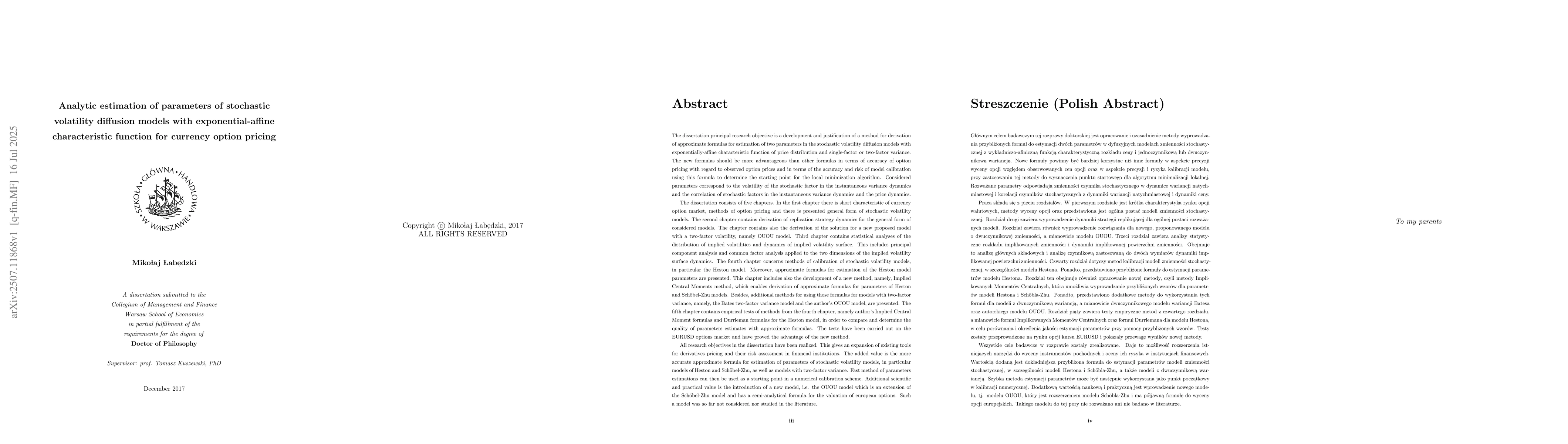This dissertation develops and justifies a novel method for deriving approximate formulas to estimate two parameters in stochastic volatility diffusion models with exponentially-affine characteristic functions and single- or two-factor variance. These formulas aim to improve the accuracy of option pricing and enhance the calibration process by providing reliable initial values for local minimization algorithms. The parameters relate to the volatility of the stochastic factor in instantaneous variance dynamics and the correlation between stochastic factors and asset price dynamics. The study comprises five chapters. Chapter one outlines the currency option market, pricing methods, and the general structure of stochastic volatility models. Chapter two derives the replication strategy dynamics and introduces a new two-factor volatility model: the OUOU model. Chapter three analyzes the distribution and surface dynamics of implied volatilities using principal component and common factor analysis. Chapter four discusses calibration methods for stochastic volatility models, particularly the Heston model, and presents the new Implied Central Moments method to estimate parameters in the Heston and Sch\"obel-Zhu models. Extensions to two-factor models, Bates and OUOU, are also explored. Chapter five evaluates the performance of the proposed formulas on the EURUSD options market, demonstrating the superior accuracy of the new method. The dissertation successfully meets its research objectives, expanding tools for derivative pricing and risk assessment. Key contributions include faster and more precise parameter estimation formulas and the introduction of the OUOU model - an extension of the Sch\"obel-Zhu model with a semi-analytical valuation formula for European options, previously unexamined in the literature.