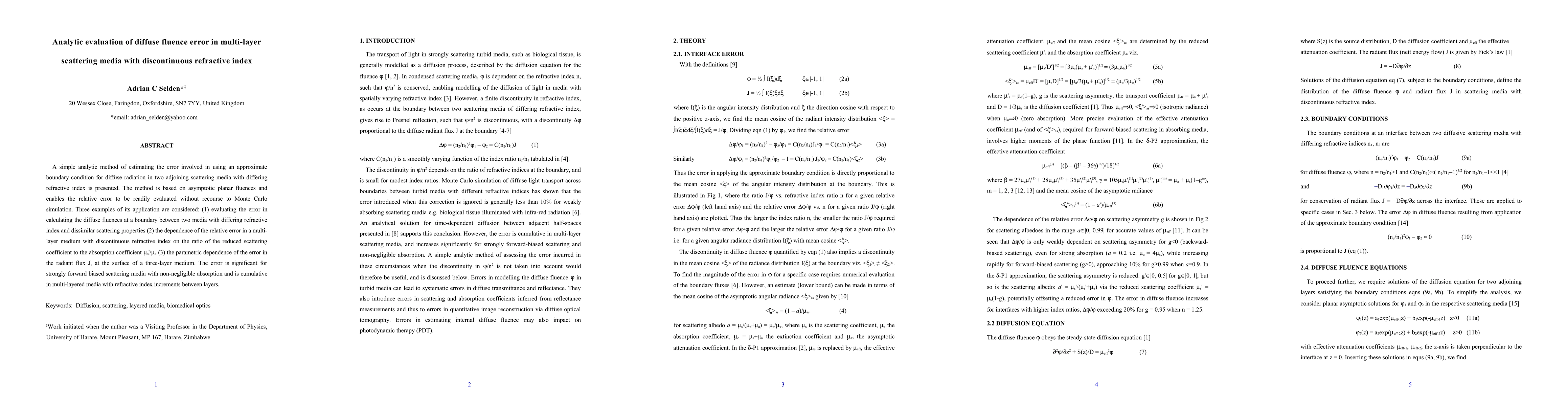 A simple analytic method of estimating the error involved in using an approximate boundary condition for diffuse radiation in two adjoining scattering media with differing refractive index is presented. The method is based on asymptotic planar fluences and enables the relative error to be readily evaluated without recourse to Monte Carlo simulation. Three examples of its application are considered: (1) evaluating the error in calculating the diffuse fluences at a boundary between two media with differing refractive index and dissimilar scattering properties (2) the dependence of the relative error in a multilayer medium with discontinuous refractive index on the ratio of the reduced scattering coefficient to the absorption coefficient ms'/ma (3) the parametric dependence of the error in the radiant flux Js at the surface of a three-layer medium. The error is significant for strongly forward biased scattering media with non-negligible absorption and is cumulative in multi-layered media with refractive index increments between layers.