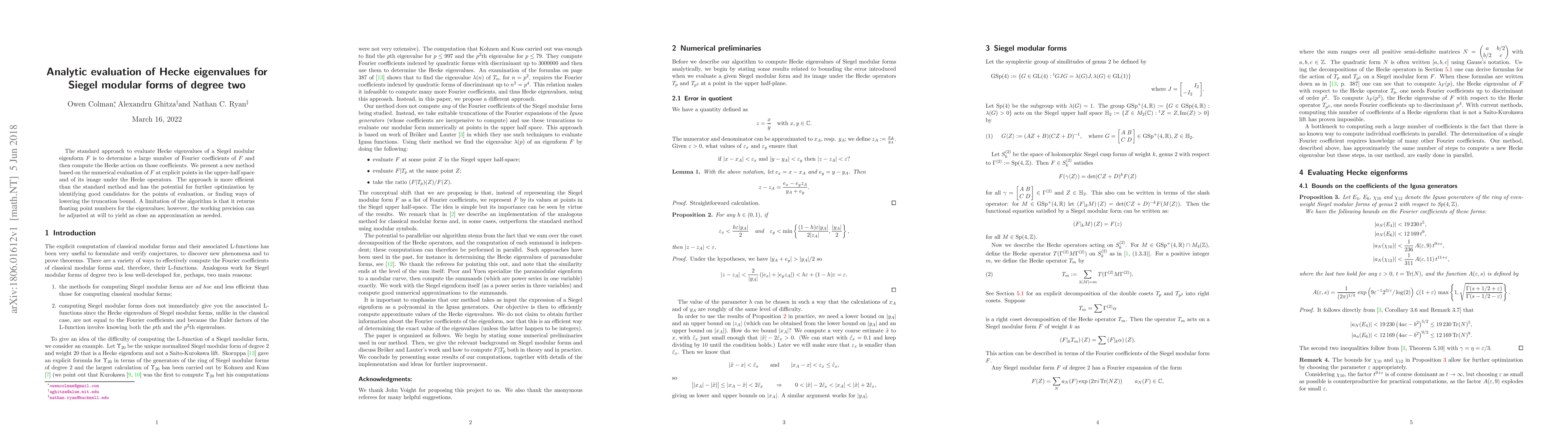 The standard approach to evaluate Hecke eigenvalues of a Siegel modular eigenform F is to determine a large number of Fourier coefficients of F and then compute the Hecke action on those coefficients. We present a new method based on the numerical evaluation of F at explicit points in the upper-half space and of its image under the Hecke operators. The approach is more efficient than the standard method and has the potential for further optimization by identifying good candidates for the points of evaluation, or finding ways of lowering the truncation bound. A limitation of the algorithm is that it returns floating point numbers for the eigenvalues; however, the working precision can be adjusted at will to yield as close an approximation as needed.