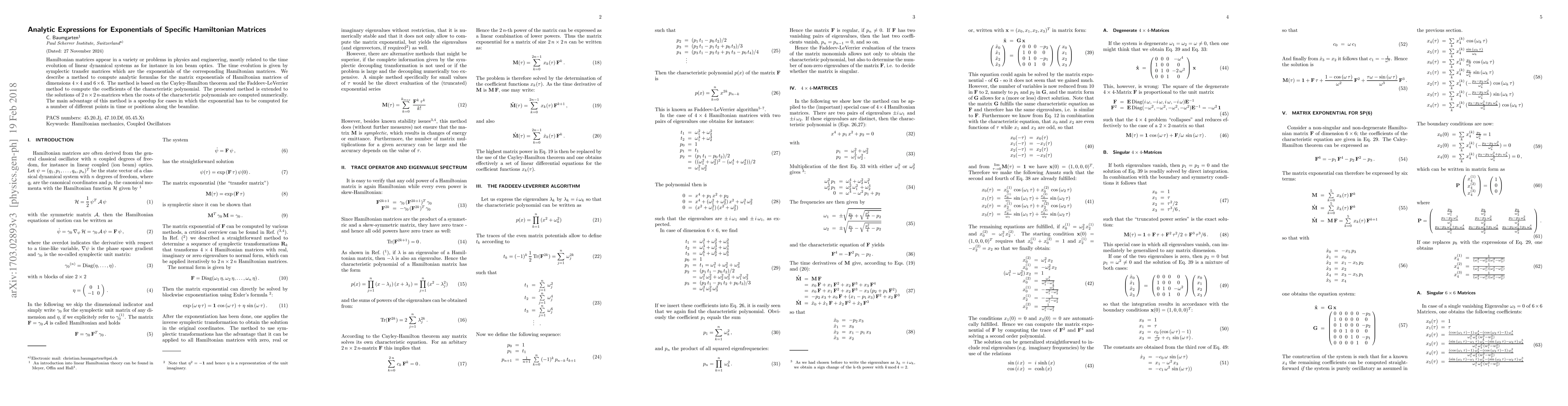 Hamiltonian matrices appear in a variety or problems in physics and engineering, mostly related to the time evolution of linear dynamical systems as for instance in ion beam optics. The time evolution is given by symplectic transfer matrices which are the exponentials of the corresponding Hamiltonian matrices. We describe a method to compute analytic formulas for the matrix exponentials of Hamiltonian matrices of dimensions $4\times 4$ and $6\times 6$. The method is based on the Cayley-Hamilton theorem and the Faddeev-LeVerrier method to compute the coefficients of the characteristic polynomial. The presented method is extended to the solutions of $2\,n\times 2\,n$-matrices when the roots of the characteristic polynomials are computed numerically. The main advantage of this method is a speedup for cases in which the exponential has to be computed for a number of different points in time or positions along the beamline.
