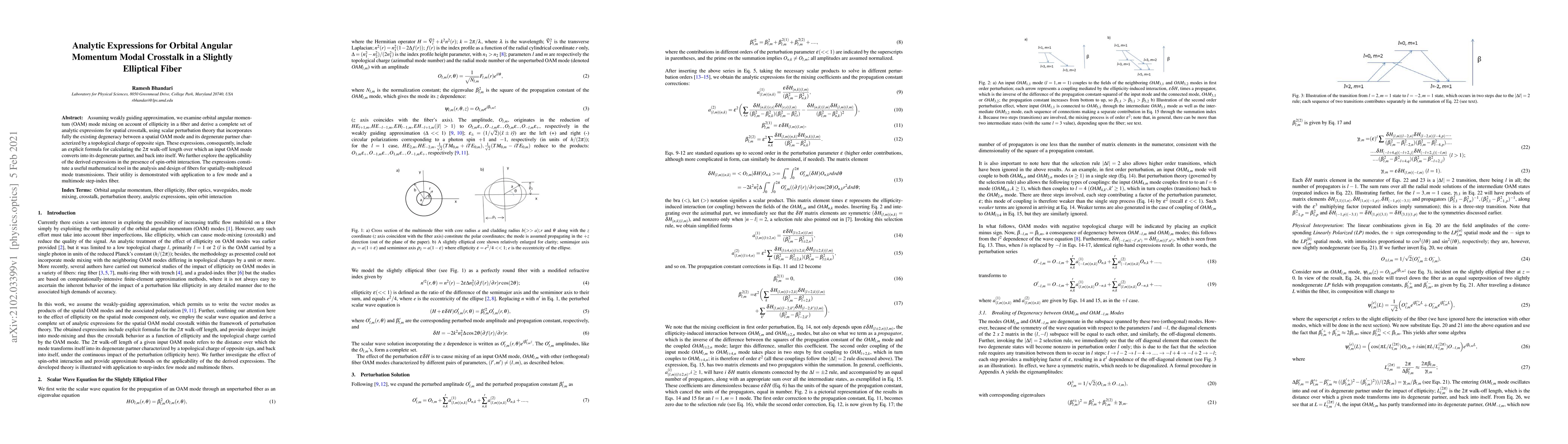 Assuming weakly guiding approximation, we examine orbital angular momentum (OAM) mode mixing on account of ellipticity in a fiber and derive a complete set of analytic expressions for spatial crosstalk, using scalar perturbation theory that incorporates fully the existing degeneracy between a spatial OAM mode and its degenerate partner characterized by a topological charge of opposite sign. These expressions, consequently, include an explicit formula for calculating the 2 pi walk-off length over which an input OAM mode converts into its degenerate partner, and back into itself. We further explore the applicability of the derived expressions in the presence of spin-orbit interaction. The expressions constitute a useful mathematical tool in the analysis and design of fibers for spatially-multiplexed mode transmissions. Their utility is demonstrated with application to a few mode and a multimode step-index fiber.