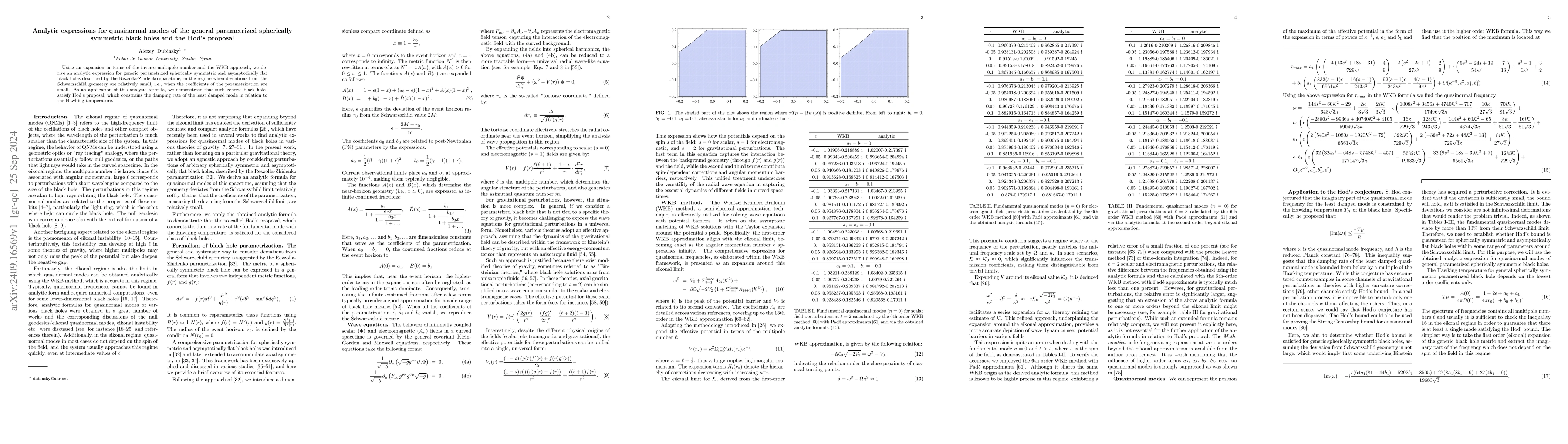 Summary: The paper derives an analytic expression for quasinormal modes of parametrized spherically symmetric black holes using an expansion and WKB approach, showing they satisfy Hod's proposal concerning the damping rate of the least damped mode relative to the Hawking temperature.