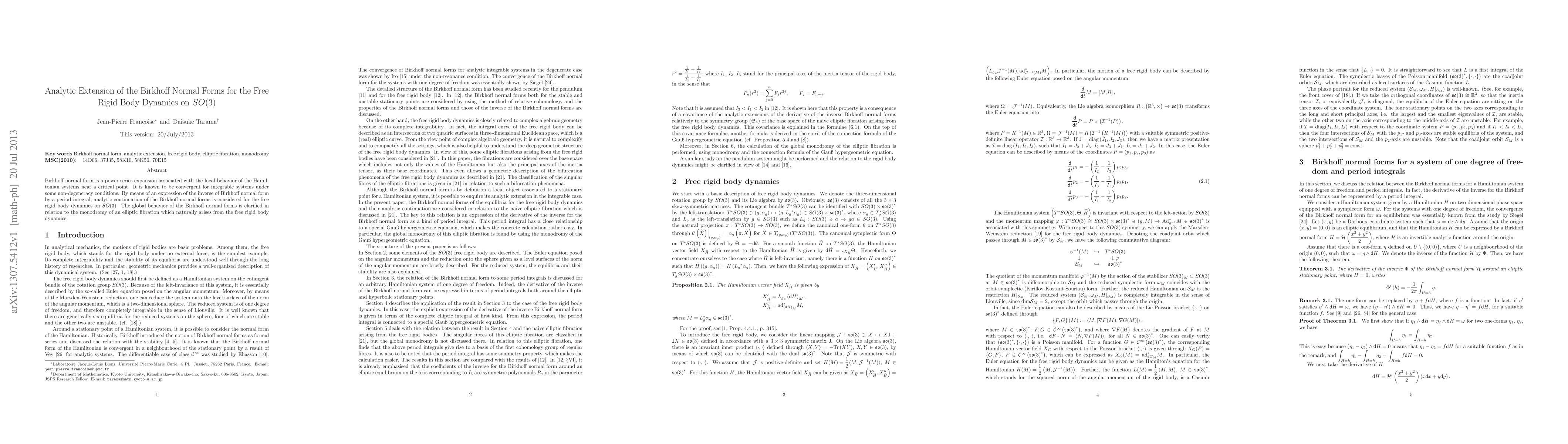 This paper explores the analytic continuation of Birkhoff normal forms for the free rigid body dynamics on SO(3), using a period integral to extend the local power series expansions globally. The study clarifies the global behavior of these forms in relation to the monodromy of an elliptic fibration inherent in the system.