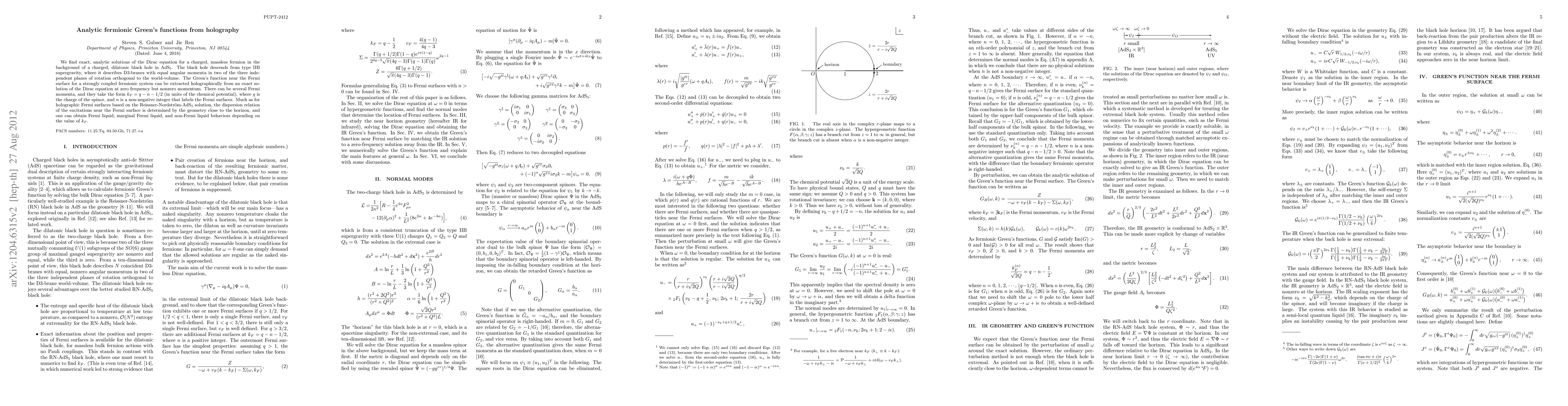 This paper derives exact analytic solutions of the Dirac equation for charged, massless fermions in a charged dilatonic black hole background within AdS_5, revealing holographic Green's functions near the Fermi surface for strongly coupled fermionic systems. The Fermi momenta, dependent on the charge and a non-negative integer, determine Fermi liquid, marginal Fermi liquid, or non-Fermi liquid behaviors.